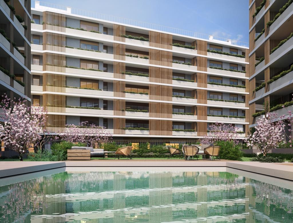 New-build three-to-four bedroom apartments around Alvalade XXI, Alta de Lisboa and Telheiras, typically €650,000-€1.8 million, with lifts, garage parking and shared gardens suited to long-term family occupancy.