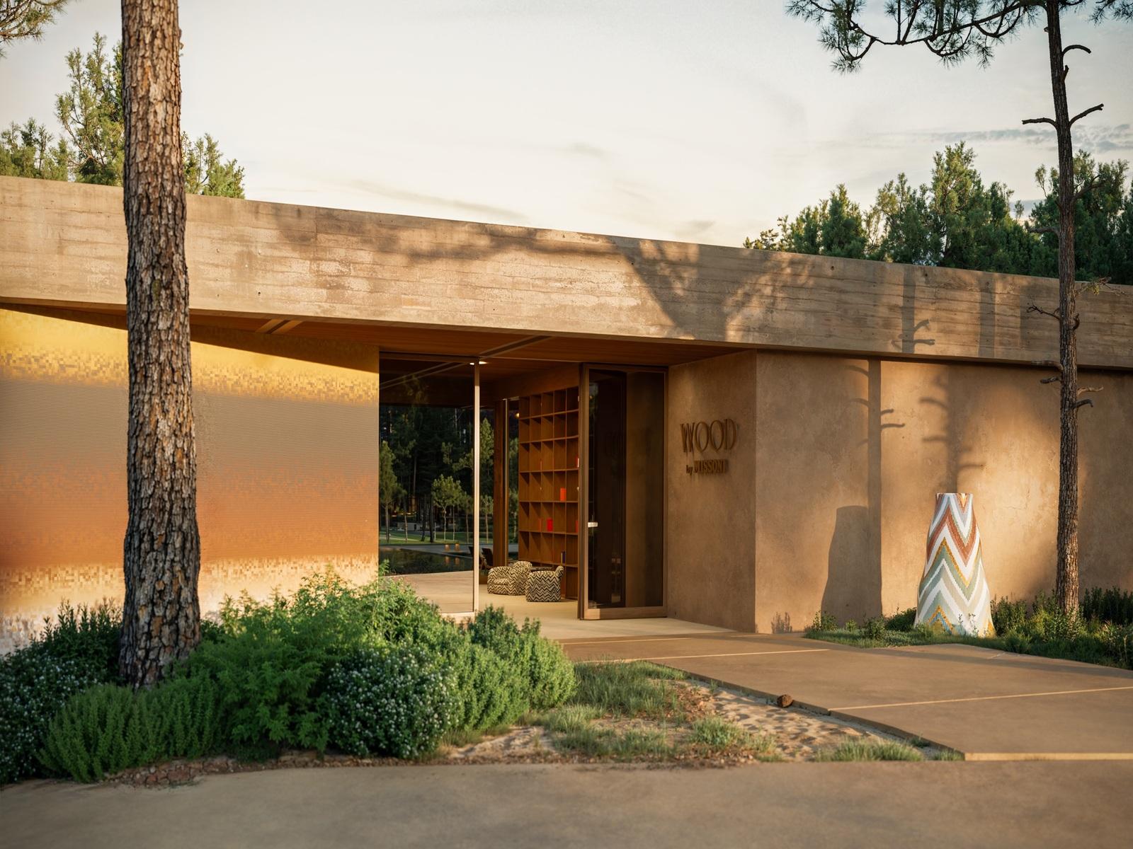The building, carefully integrated into the landscape, was designed as a suspension bridge between the pine trees, with wooden mesh facades, floor-to-ceiling windows and Missoni interiors inspired by the colours of the ocean and the natural surroundings.