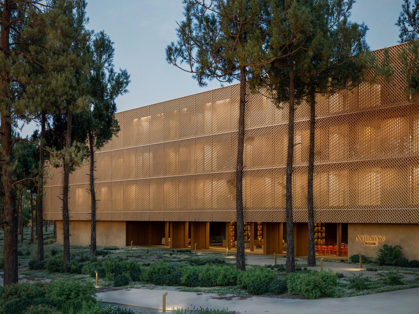 The building, carefully integrated into the landscape, was designed as a suspension bridge between the pine trees, with wooden mesh facades, floor-to-ceiling windows and Missoni interiors inspired by the colours of the ocean and the natural surroundings.