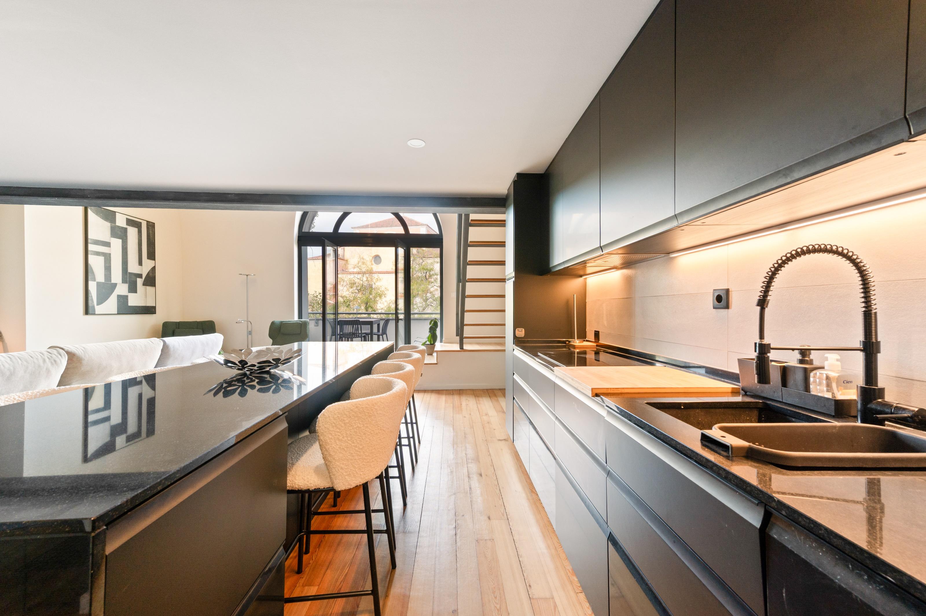 The space is developed on two floors, combining the industrial charm of the open space concept with contemporary comfort: