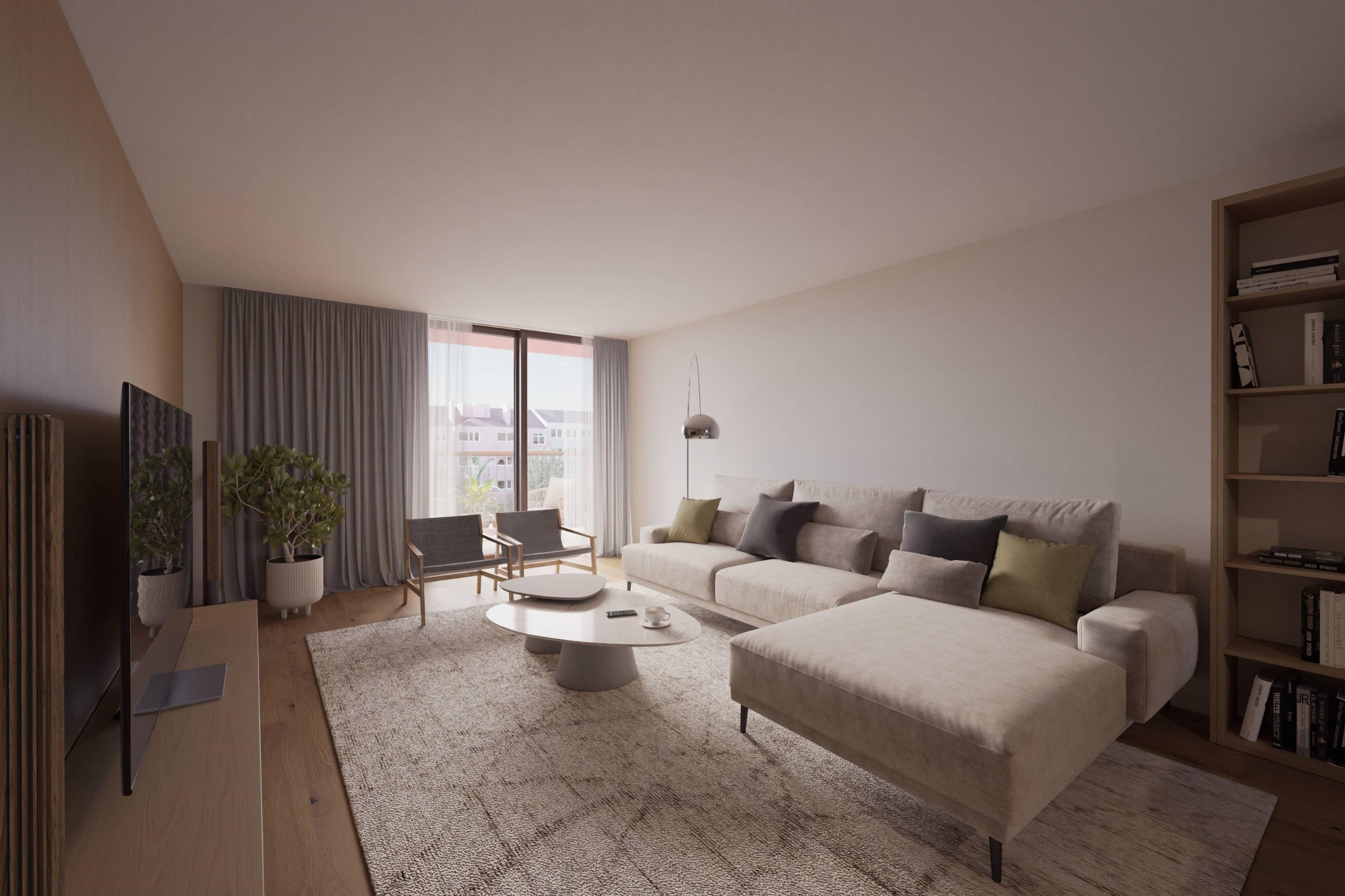 The apartment comprises an openplan living room with a fully equipped kitchen, one bedroom with builtin wardrobe and one bathroom. Both the living room and the bedroom provide access to the balconies. It features air conditioning, underfloor heating in the private bathroom floors, thermally broken window frames with double glazing, and abundant natural light.