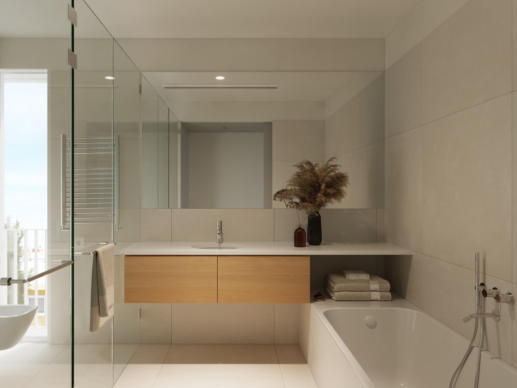 New 2-bedroom apartment, with 102 m² of gross private area, covered balcony and private rooftop with 112 m² with private swimming pool and 2parking spaces, in Alvôr The Breeze development, in Alvor, Algarve. The apartments stand out for their sustainable and sophisticated materials, fully equipped kitchen with integrated appliances, grey ceramic flooring, white Silestone quartz worktops and aluminium window frames with thermal break and double glazing.