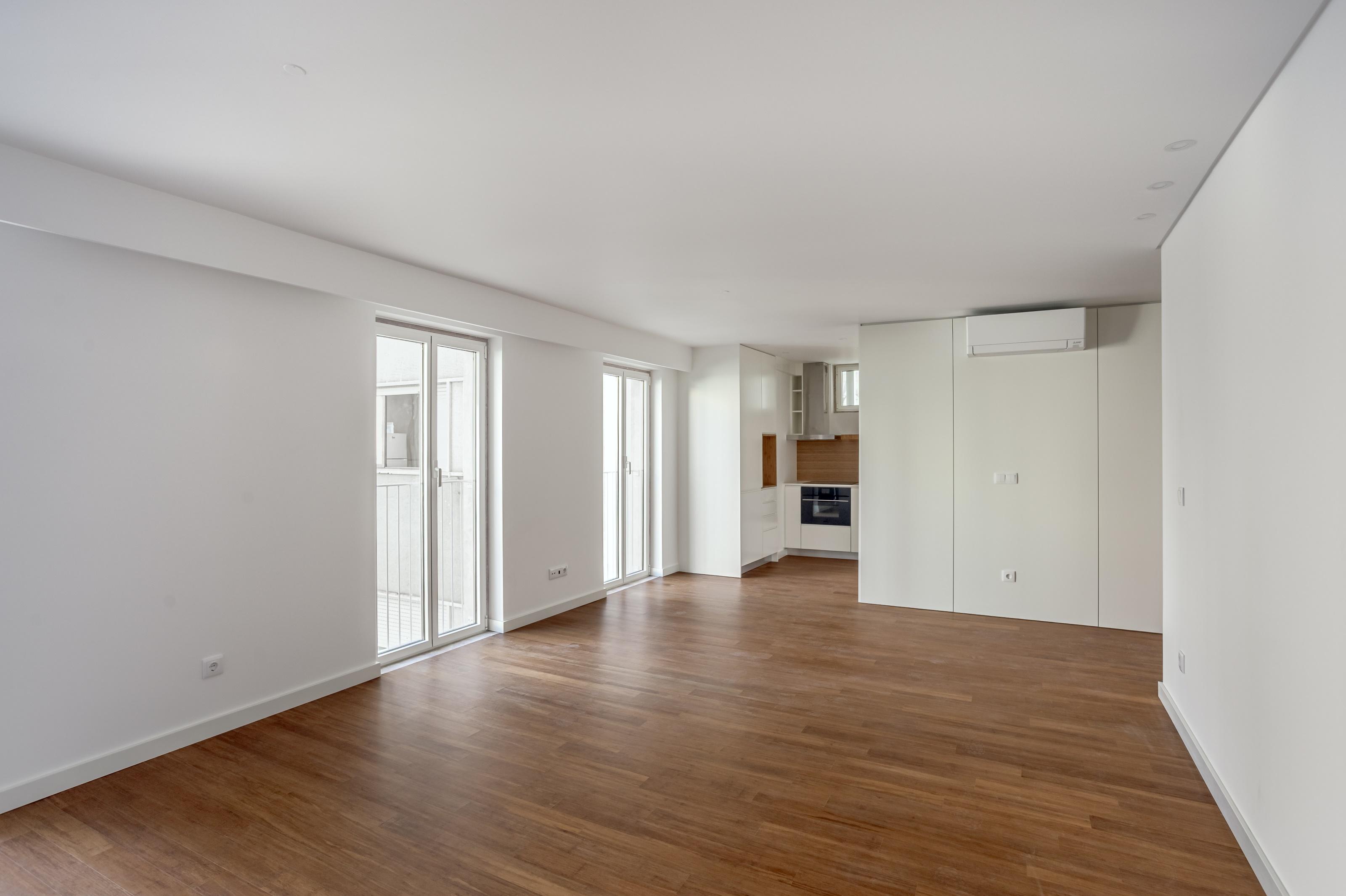2-bedroom apartment with 98 m² of gross private area and a 9 m² balcony, located in Palmira 28, Arroios, Lisbon, with exclusive parking for residents.