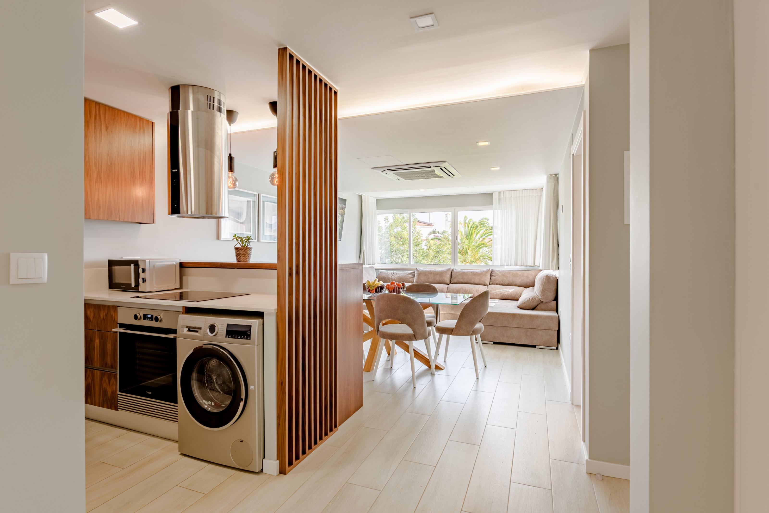 Situated on the first floor of the building, the apartment has been completely renovated and is sold fully furnished. It comprises an open-plan living area with a fully equipped kitchen featuring brand new appliances, two bedrooms (one en-suite), and a family bathroom. Air conditioning is available in all rooms.