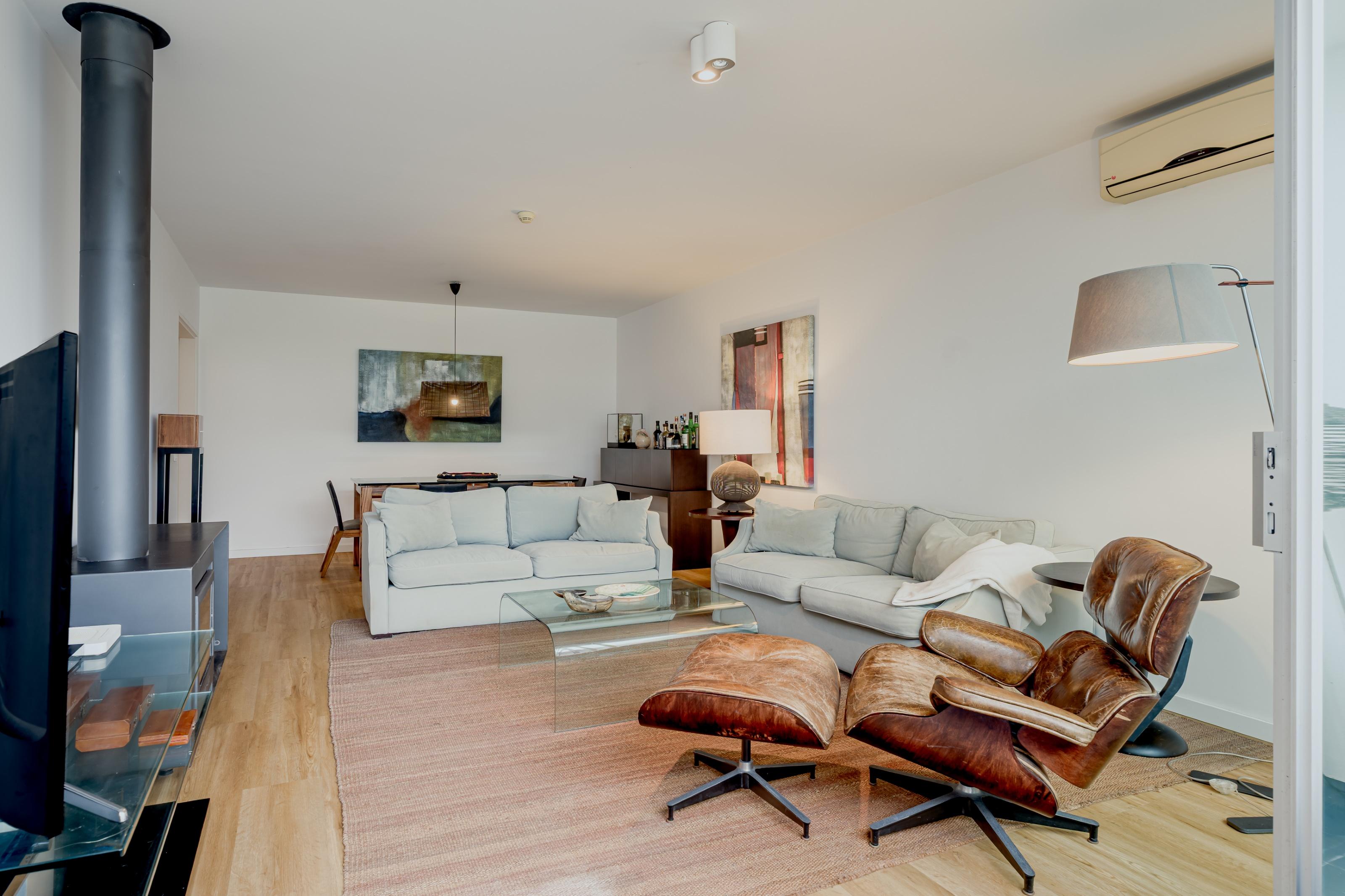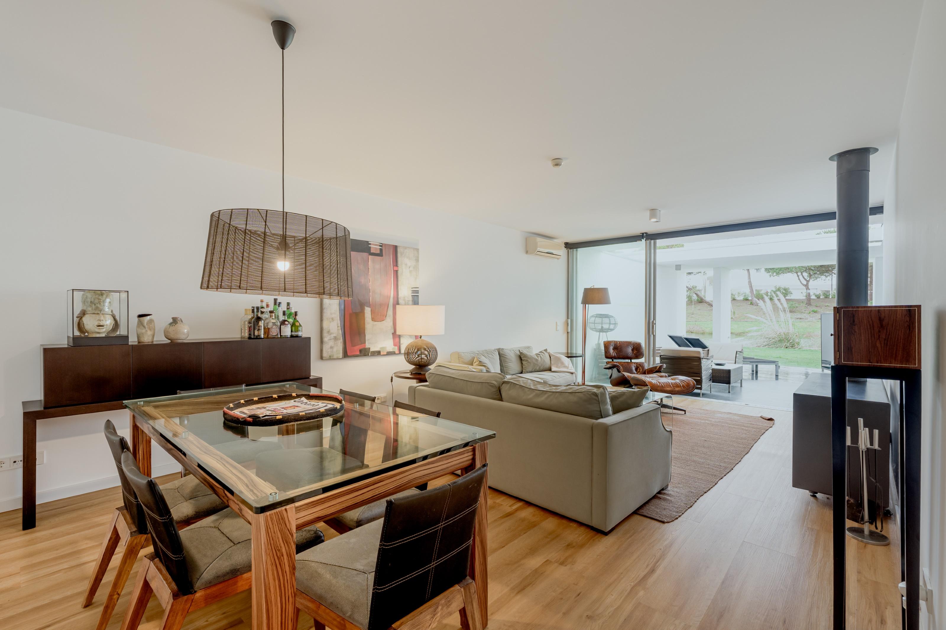 Designed by architect Nuno Graça Moura, the villa comprises a 28 sqm living room with fireplace, two en suite bedrooms, and a fully equipped kitchen with access to a private 48 sqm patio overlooking the garden and the condominium’s lake. It features reversible air conditioning, electric blackout curtains and a 37 sqm garage.