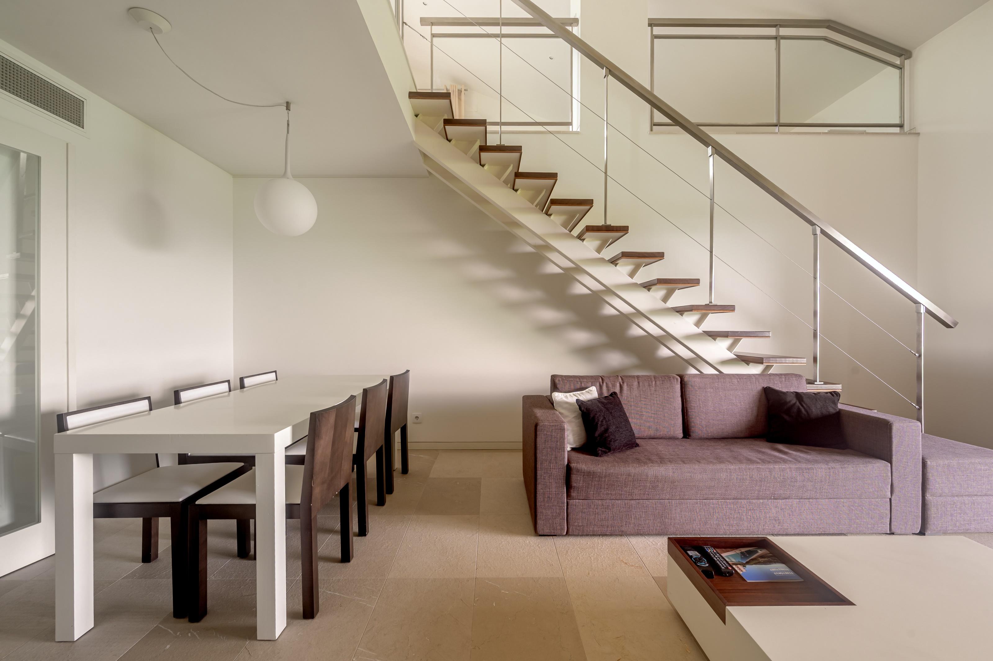 The apartment comprises a large entrance hall, kitchen, living room and dining room. The two living areas are separated by a wall featuring a fireplace, creating two distinct environments. Also on this floor, there is a complete social bathroom, an en-suite bedroom with a generous wardrobe, a balcony overlooking the condominium entrance and bathroom. On the upper floor we find a large open space area that can be used as a living room or two bedrooms, an office area with windows and a complete bathroom. This area has direct access to the 86 m² rooftop which features a jacuzzi, barbecue and where you can enjoy wonderful views of the Sado River, Serra da Arrábida and Setúbal.