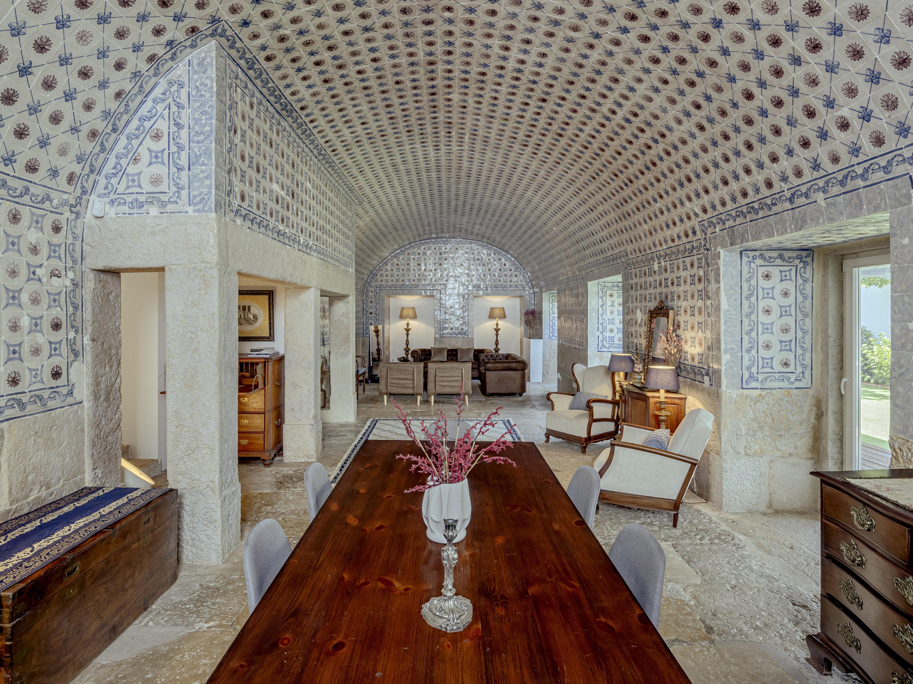 The apartment, which benefits from plenty of natural light, consists of a spacious living and dining room of about 100m2, all covered with 18th century tiles and with direct access to the garden, kitchen, three suites and a service bathroom.