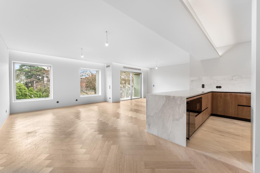 The apartment features three en-suite bedrooms, each with its own private bathroom, ensuring maximum privacy and comfort. The living room extends seamlessly onto a balcony, offering open views over the city and a distant glimpse of the river. Its superb south-facing orientation floods the interiors with natural light throughout the day. The fully equipped kitchen, fitted with SMEG appliances — including a wine cooler, separate fridge and freezer — combines functionality and elegance, elevating every culinary experience.