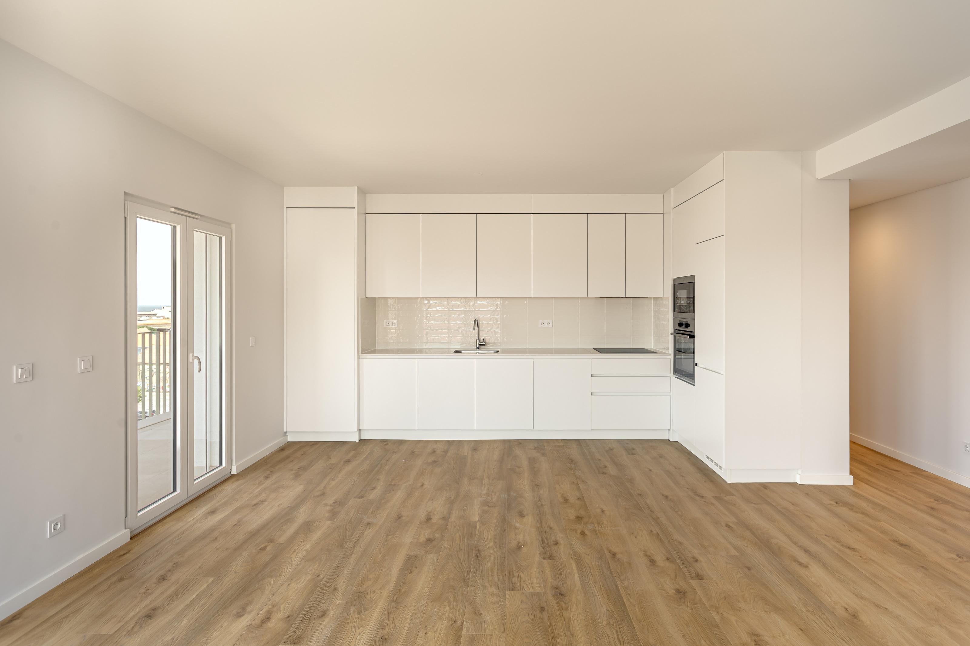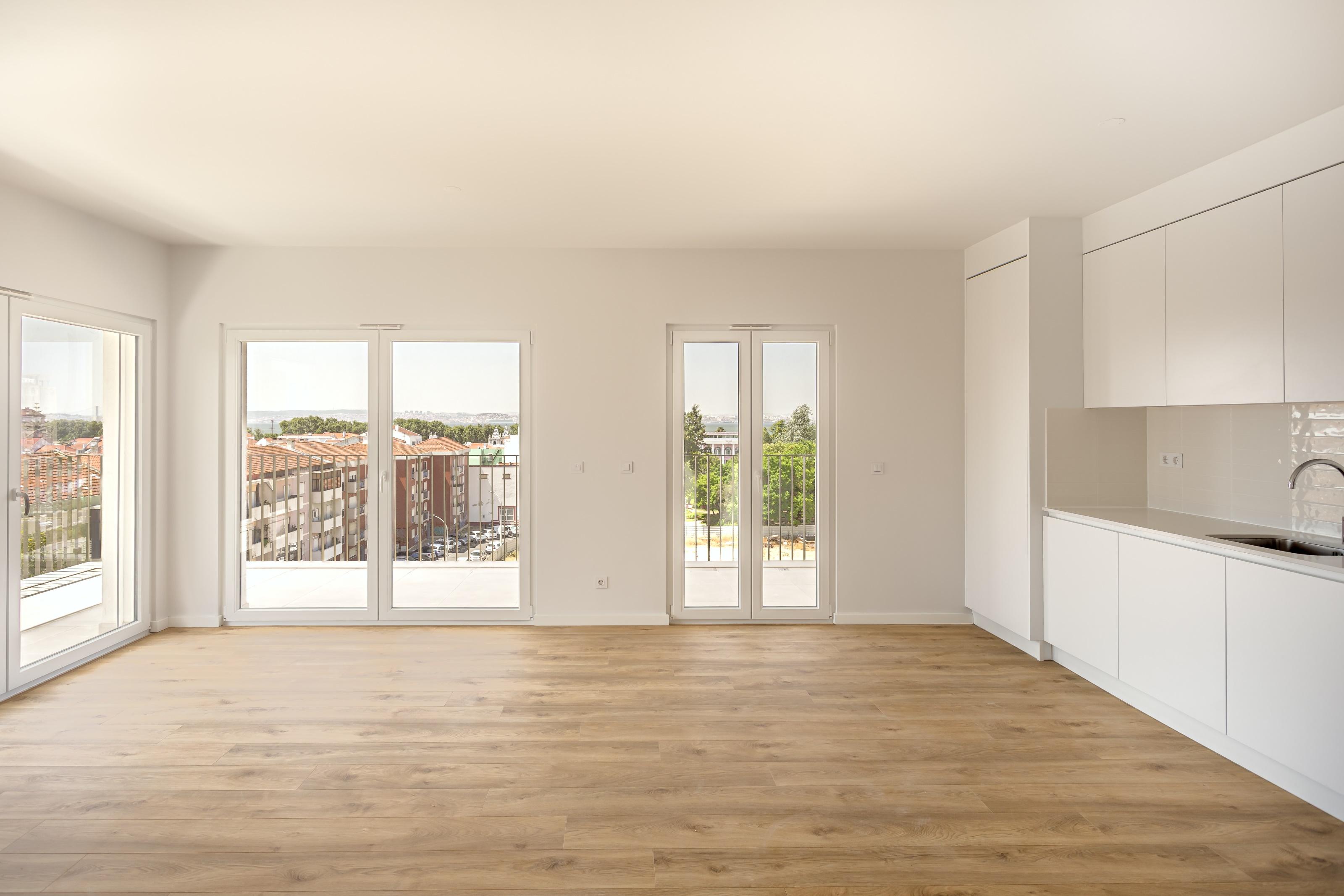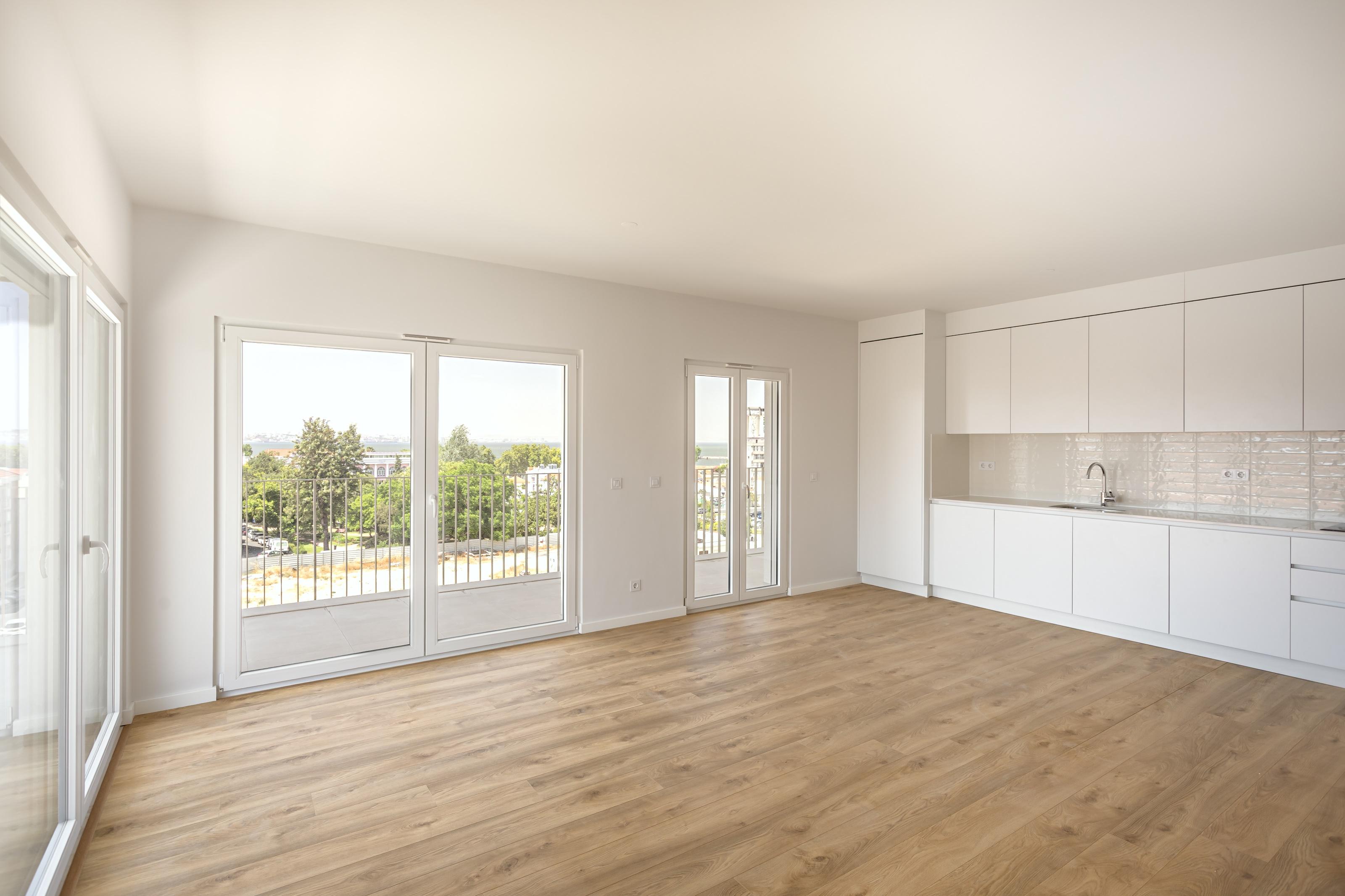 3-bedroom apartment with 153 sqm of private gross area, 48 sqm balcony with river view and Lisbon city view, two parking spaces and storage room, in the private condominium with swimming pool Jardim Barreiro, in Barreiro, Setúbal.