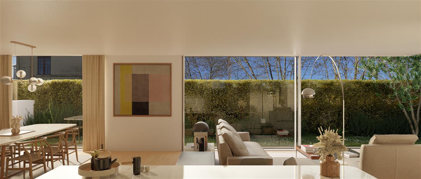 The apartment comprises a spacious 34 sqm living room with access to the terrace/garden, kitchen equipped with SMEG appliances, three suites with wardrobes, a guest bathroom and laundry room. The kitchen furniture is made of natural oak wood, combining functionality and design. The countertop is in Krion Beige Marfil and the kitchen floor is covered with Estremoz marble, ensuring durability. The bathroom walls are covered with Estremoz marble. The social area and bedroom floors are in natural oak wood, creating a cozy and elegant atmosphere. The wardrobes are carefully designed with oak slats and linen interior, offering functionality and elegance in every detail.