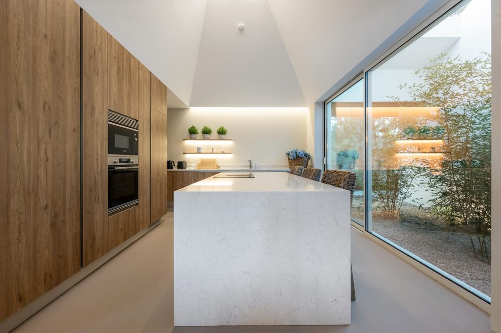 The open-plan kitchen flows effortlessly into the dining and living areas, creating a bright and inviting atmosphere with stunning views over the pool and outdoor spaces.