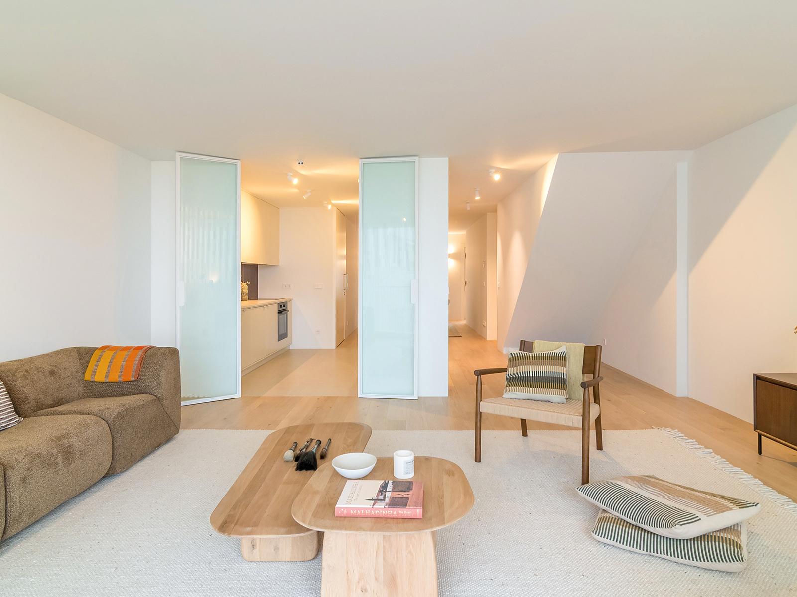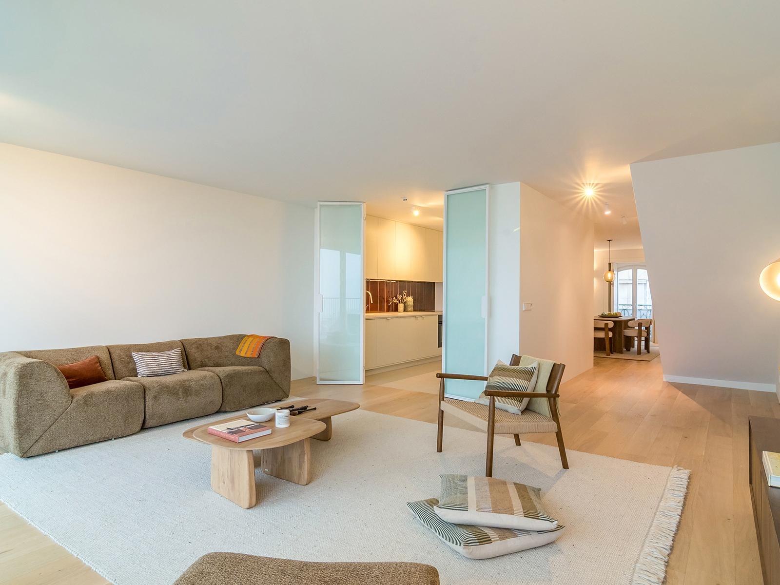 On the lower floor, the apartment features a spacious south-facing living room that extends onto the balcony. The kitchen, equipped with Miele appliances, is harmoniously integrated into the social area between the living and dining rooms. This floor also includes a guest bathroom.