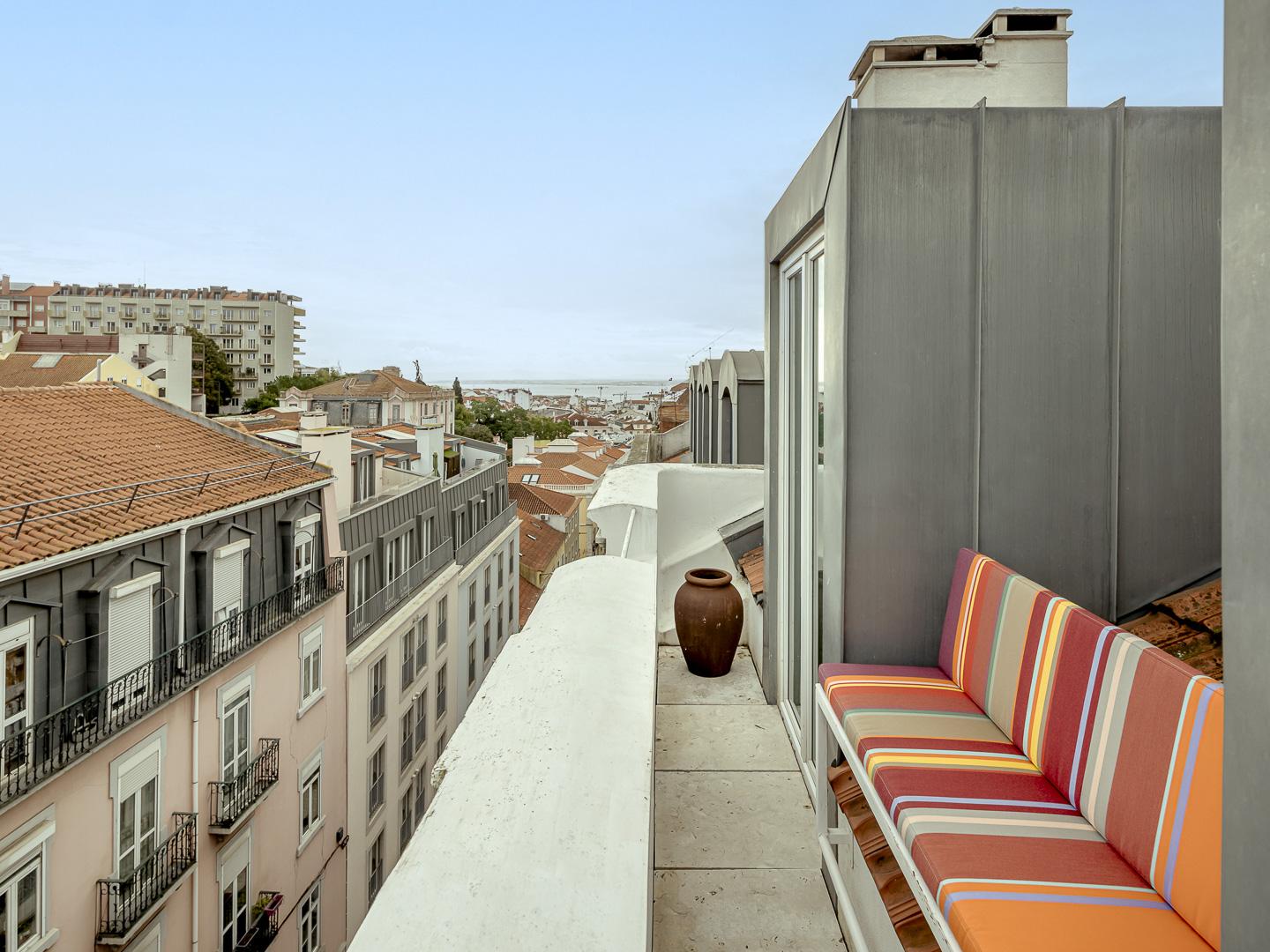 The apartment is distributed over two floors. The upper floor includes the social area, with a living and dining room featuring a 4m ceiling height and direct access to the terraces, which offer panoramic views over the city, Príncipe Real, and the Tagus River. The kitchen is equipped with high-efficiency appliances. Air conditioning is installed throughout all rooms.