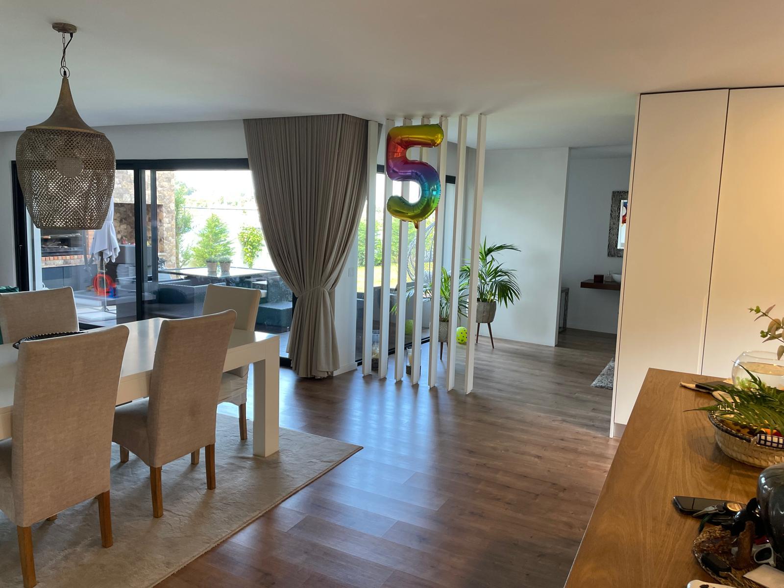 The social area comprises a spacious living room with a fireplace insert, integrated into an openplan layout with dining area and fully furnished and equipped kitchen. All rooms in this area have direct access to the garden, offering excellent natural light and a smooth transition to the exterior. Climate control is ensured by a central ducted airconditioning system.