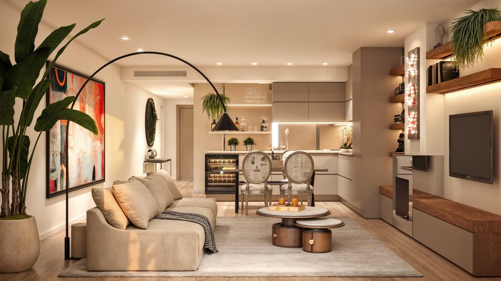 An open-plan kitchen seamlessly connected to a spacious living room;