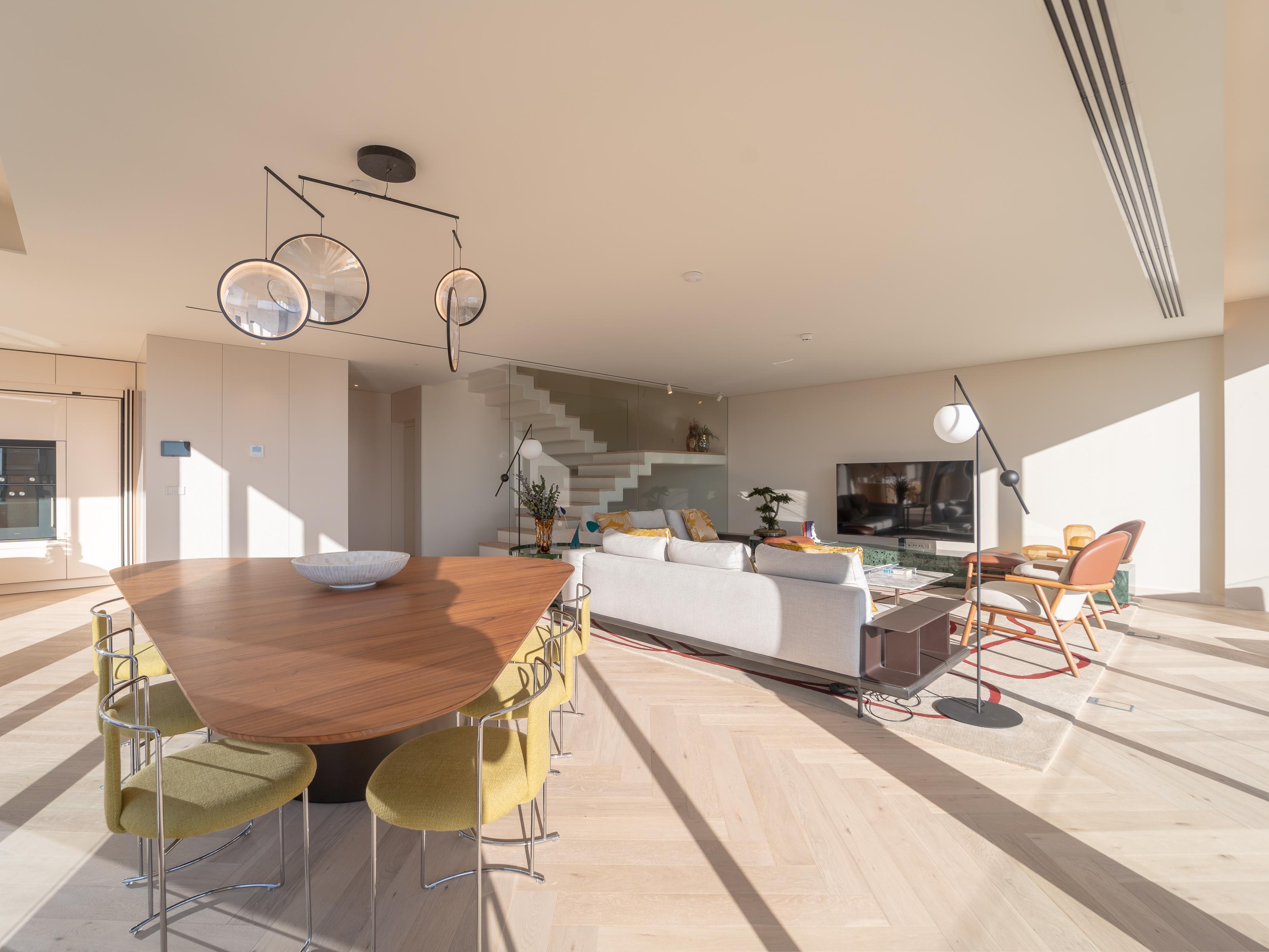 No piso intermédio, a zona social distingue-se pela sua amplitude e luminosidade. A sala de estar, com cerca de 60 m2, prolonga-se naturalmente para o jardim privativo e para uma varanda, criando um ambiente ideal para momentos de lazer ou convívio.