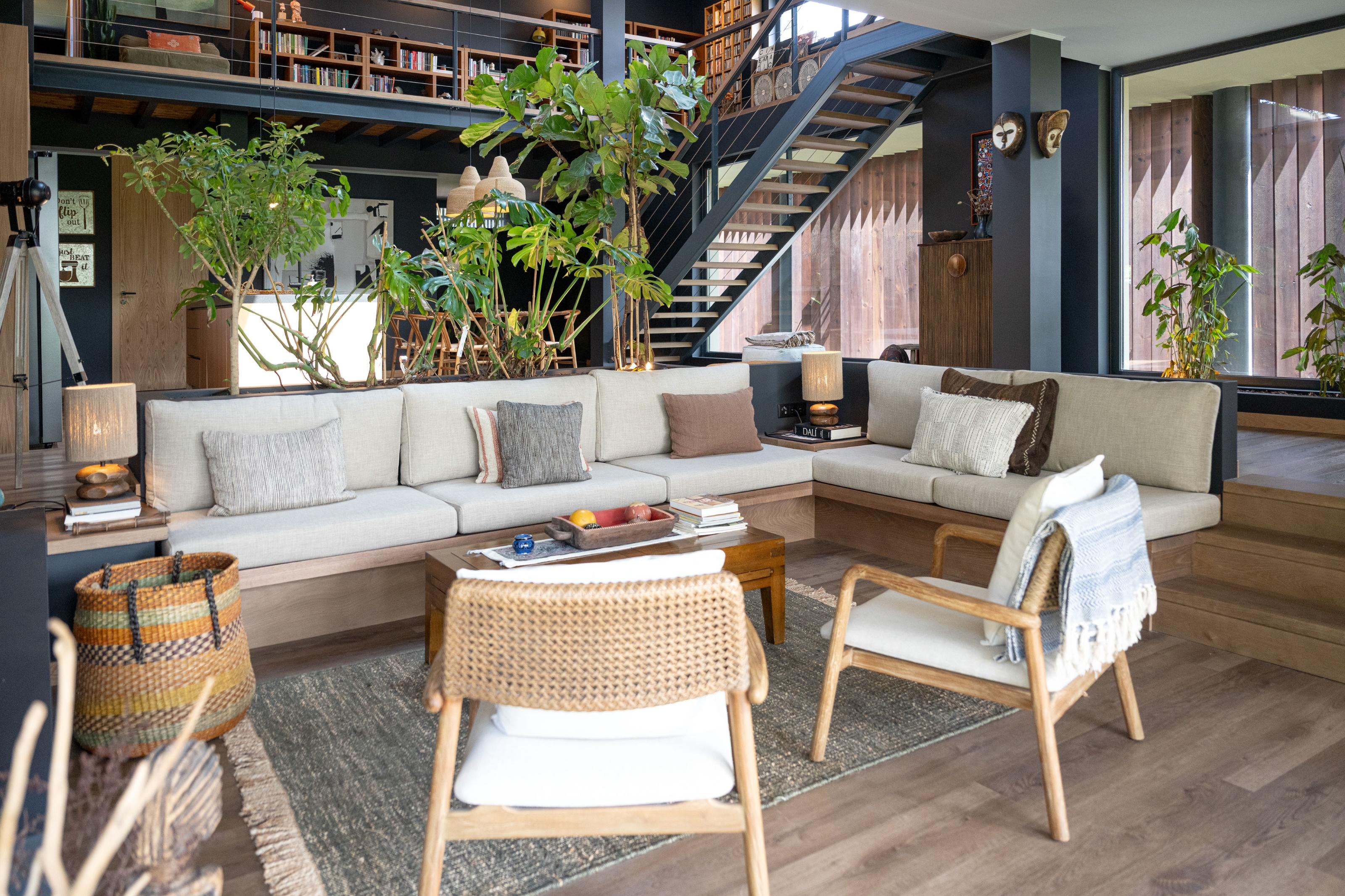 Upstairs, a mezzanine with a reading space and three en-suite bedrooms. The 27 m² master suite offers panoramic views of the garden, pool, and lagoon, complemented by a private balcony. The two additional bedrooms, each 15 m², also include balconies overlooking the lagoon, ensuring comfort and privacy for all occupants.