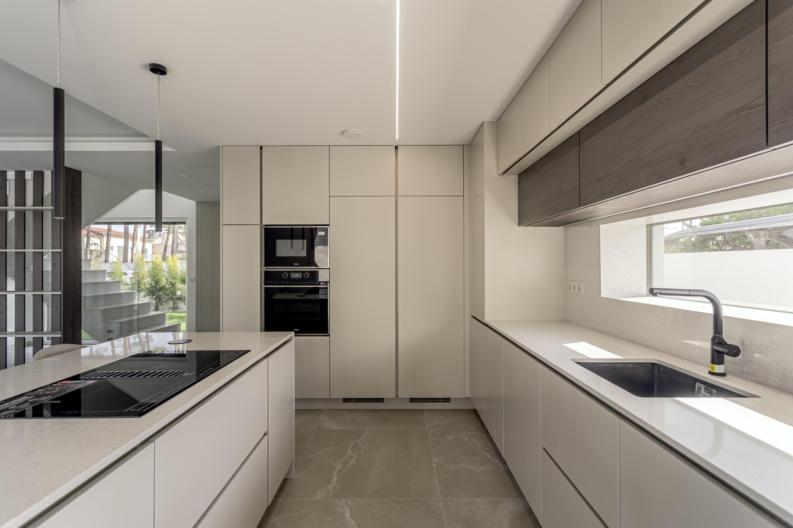 On the ground floor it has a spacious living room with open space kitchen that offers direct access to the garden and a guest bathroom. On the upper floor, master suite with walk-in closet, two bedrooms and a bathroom. The outdoor area, carefully designed, features garden, swimming pool, dining and leisure area and barbecue. On the ground floor, the villa also has a laundry room, garage for one car and parking area for two cars.