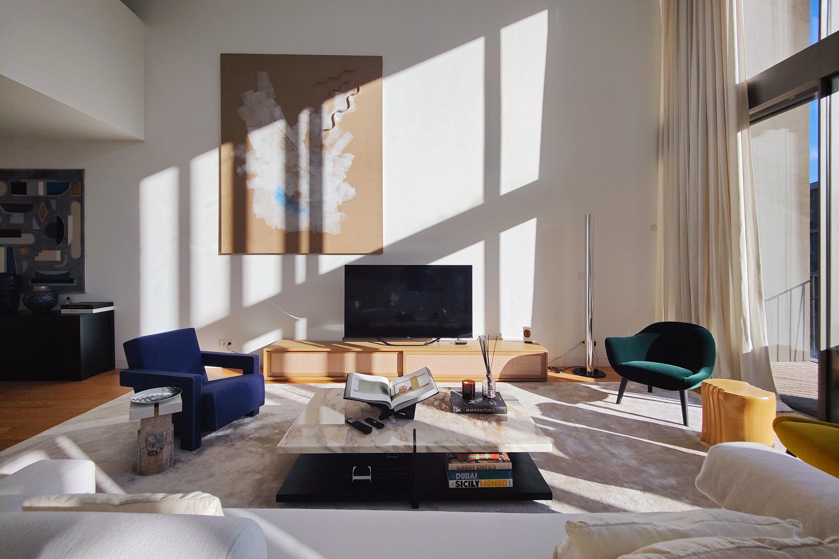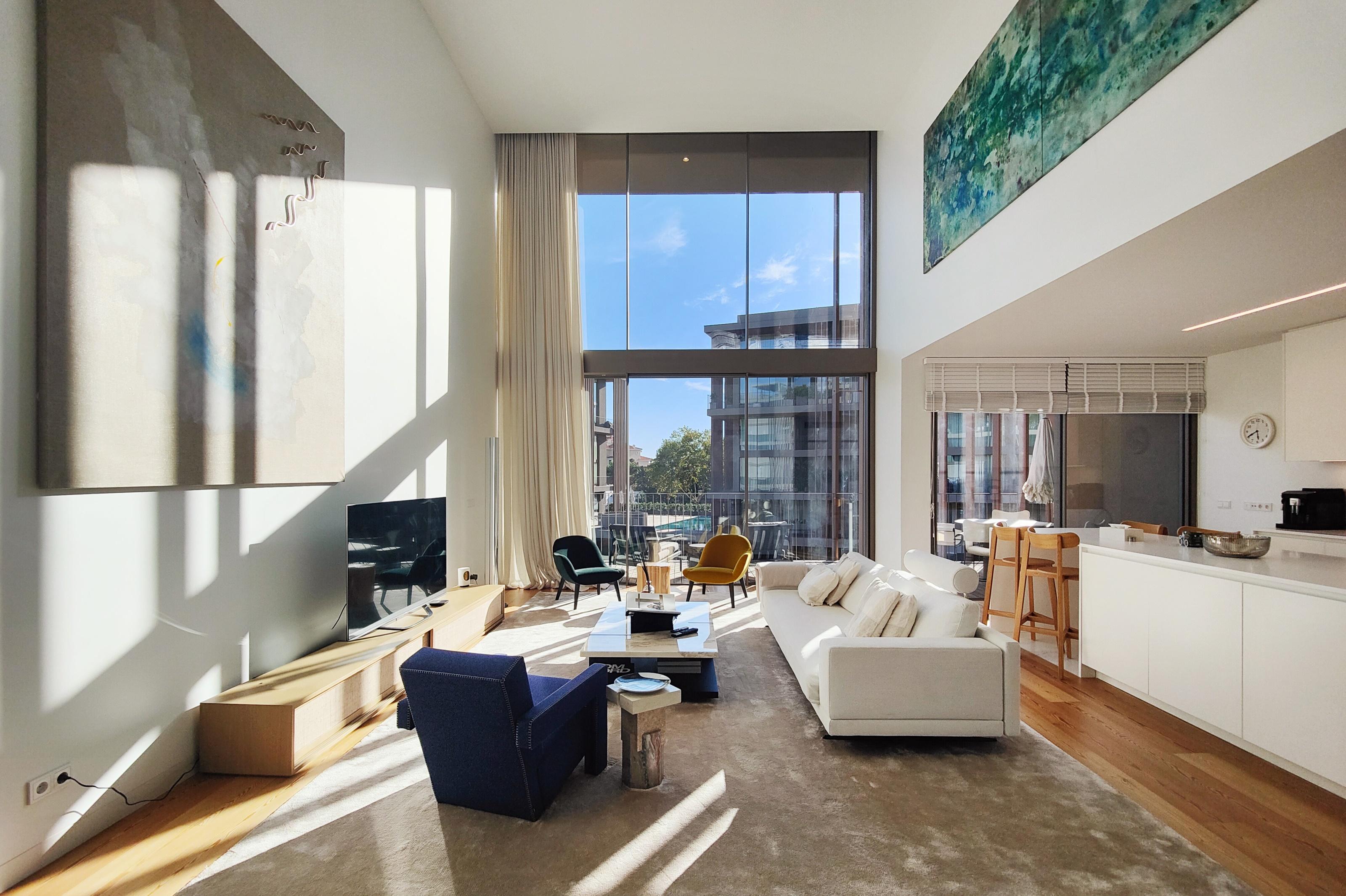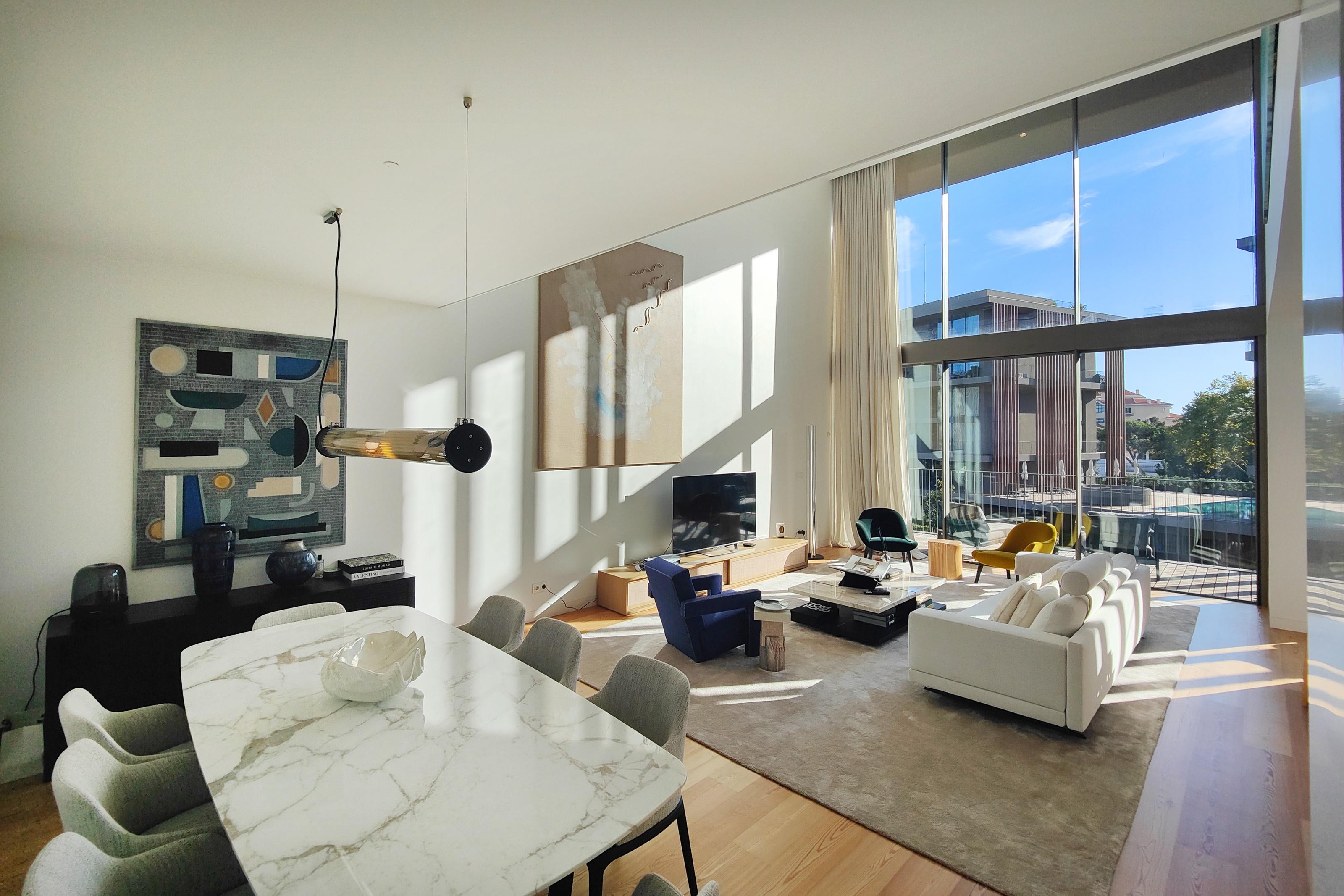 Sold fully furnished, this property stands out for the uniqueness of its architecture, with double-height areas that give amplitude and luminosity, balconies and windows with large spans, perfect for enjoying the climate of Cascais, a winter garden that makes the transition between spaces.
