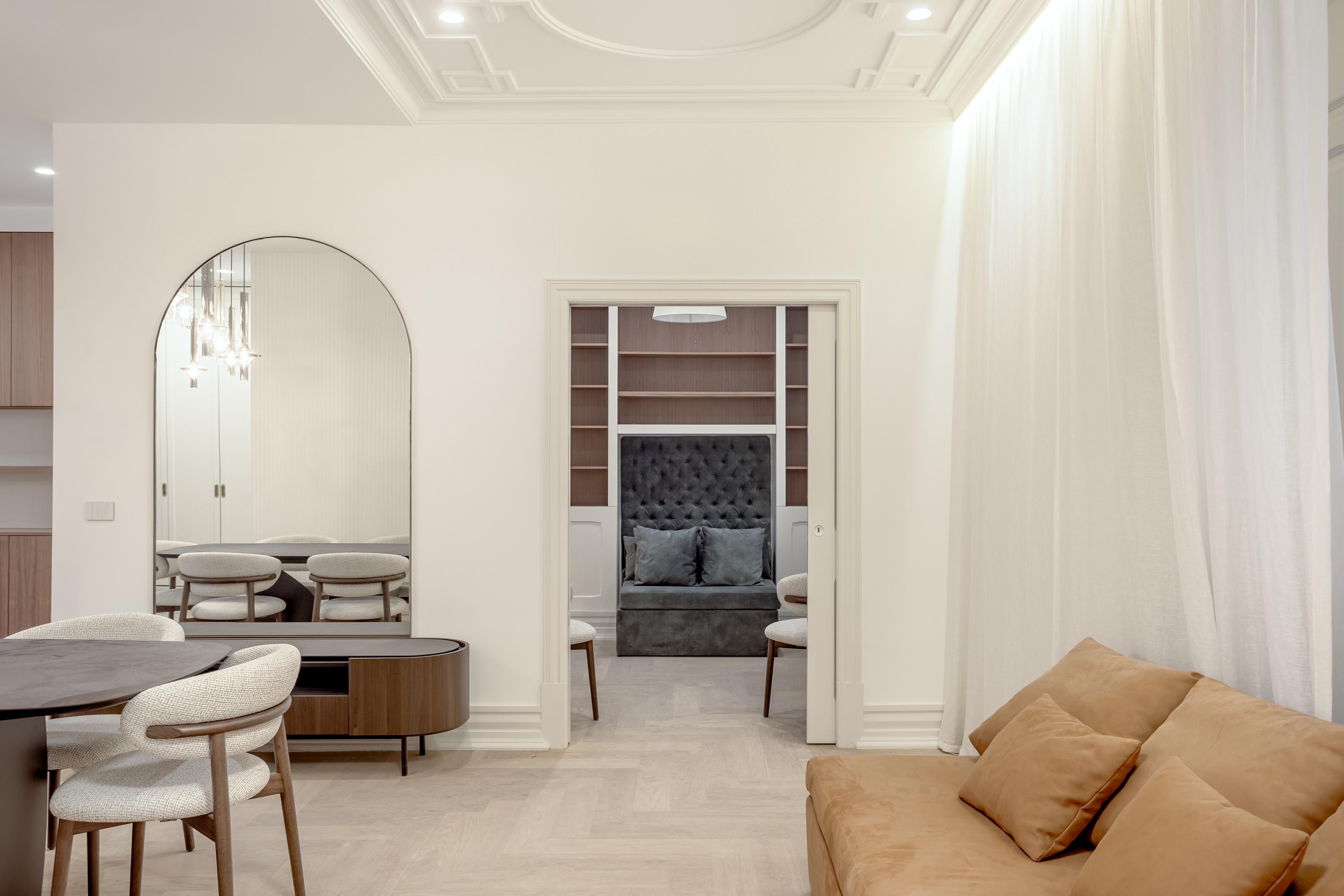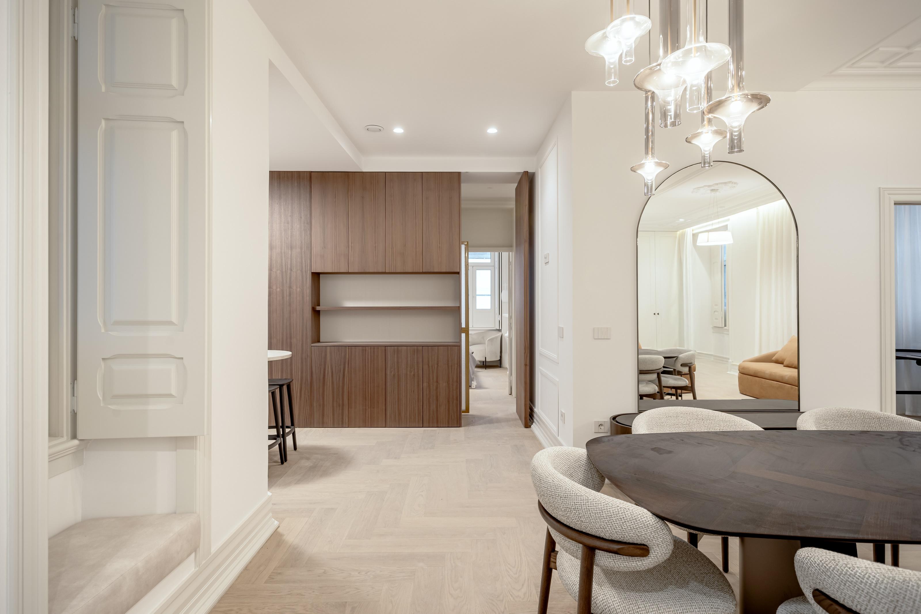 Set within a fully refurbished building with only one unit per floor and an elevator, the apartment comprises an openplan living and dining room with a fully equipped kitchen and access to the balcony, three bedrooms, one of which is an ensuite with walkin closet, and two bathrooms.