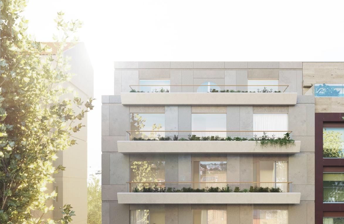 Set in a building with only five floors and elevator, it features contemporary architecture with just one apartment per floor. This apartment comprises an entrance hall, a 44 sqm living room with direct access to a large west-facing terrace, and a guest bathroom. In the private area, there are two suites and two bedrooms supported by a bathroom, with access to a 13 sqm balcony. At this stage of the project, it can be converted into a 3-bedroom apartment.