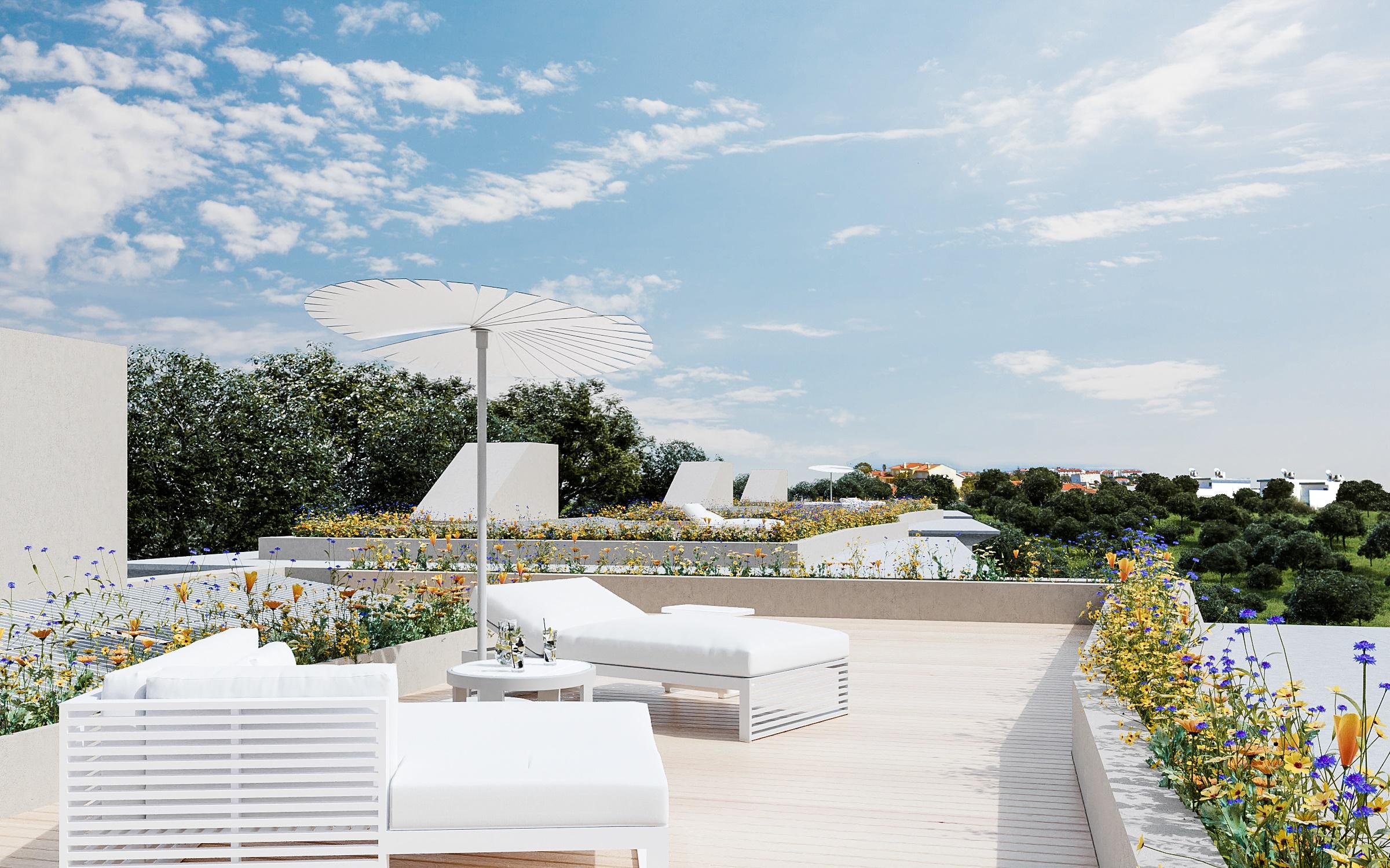 This villa is situated within a gated community of 4 villas and spans three floors, distributed as follows: the ground floor features an entrance hall, laundry room equipped with Miele appliances, technical area, storage room, and garage for four cars. The upper floor houses three suites, with the master suite featuring a walk-in closet, and all with access to a terrace with sea views. On the top floor, we find the social area of the house, with access to a terrace with pool and sea views, featuring an integrated kitchen fully equipped with Miele appliances, one bedroom, a full guest bathroom, and stairs leading to the rooftop.