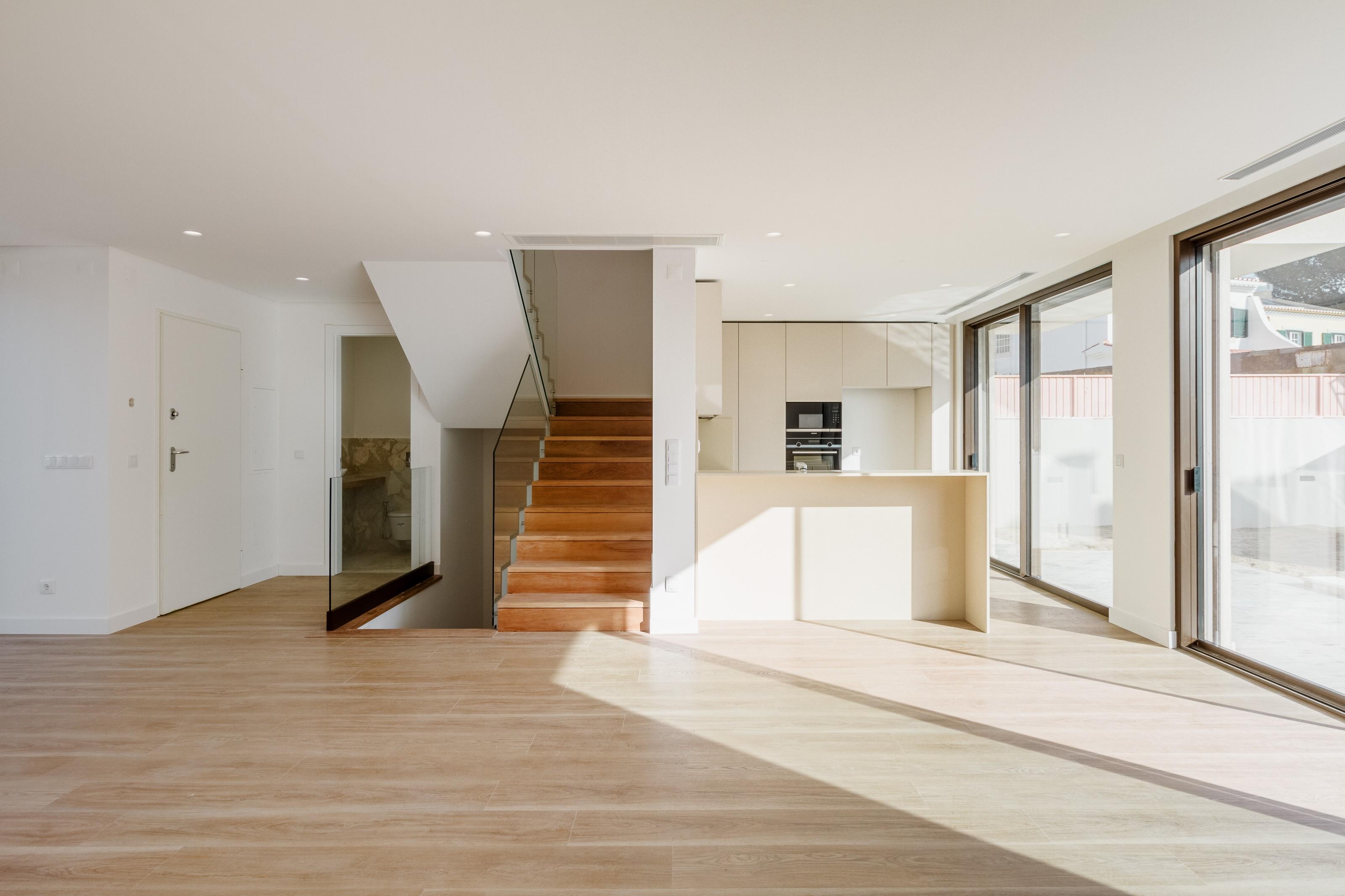 4-bedroom villa with 294 sqm of gross construction area, with garden, swimming pool, and garage in the Aldeia de Juzo, Cascais. Distributed over three floors. The entrance floor features a spacious living room with 42 sqm, along with an open-plan kitchen area, fully fitted with quality appliances, and a guest toilet. The upper floor has three bedrooms, one of which is a suite, and a full bathroom. The basement has a room/office with access to a garden. There is also storage space and a laundry room. Modern architecture and high-quality finishes.