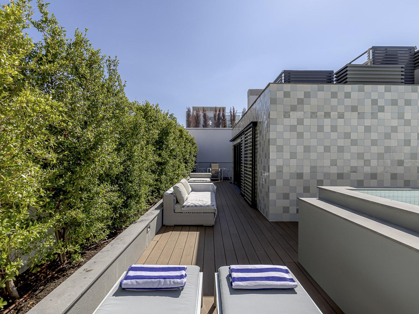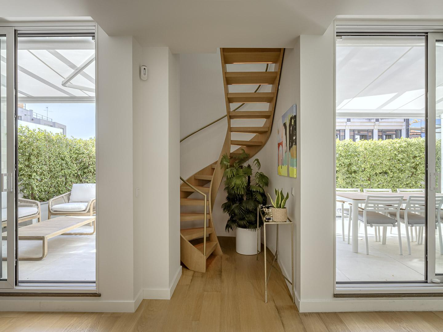 The flat features a spacious and bright reception room with access to two terraces on both sides, a fully fitted kitchen with superior quality finishes, and four en-suite bedrooms distributed across two floors, one of which is complemented by a large dressing room.