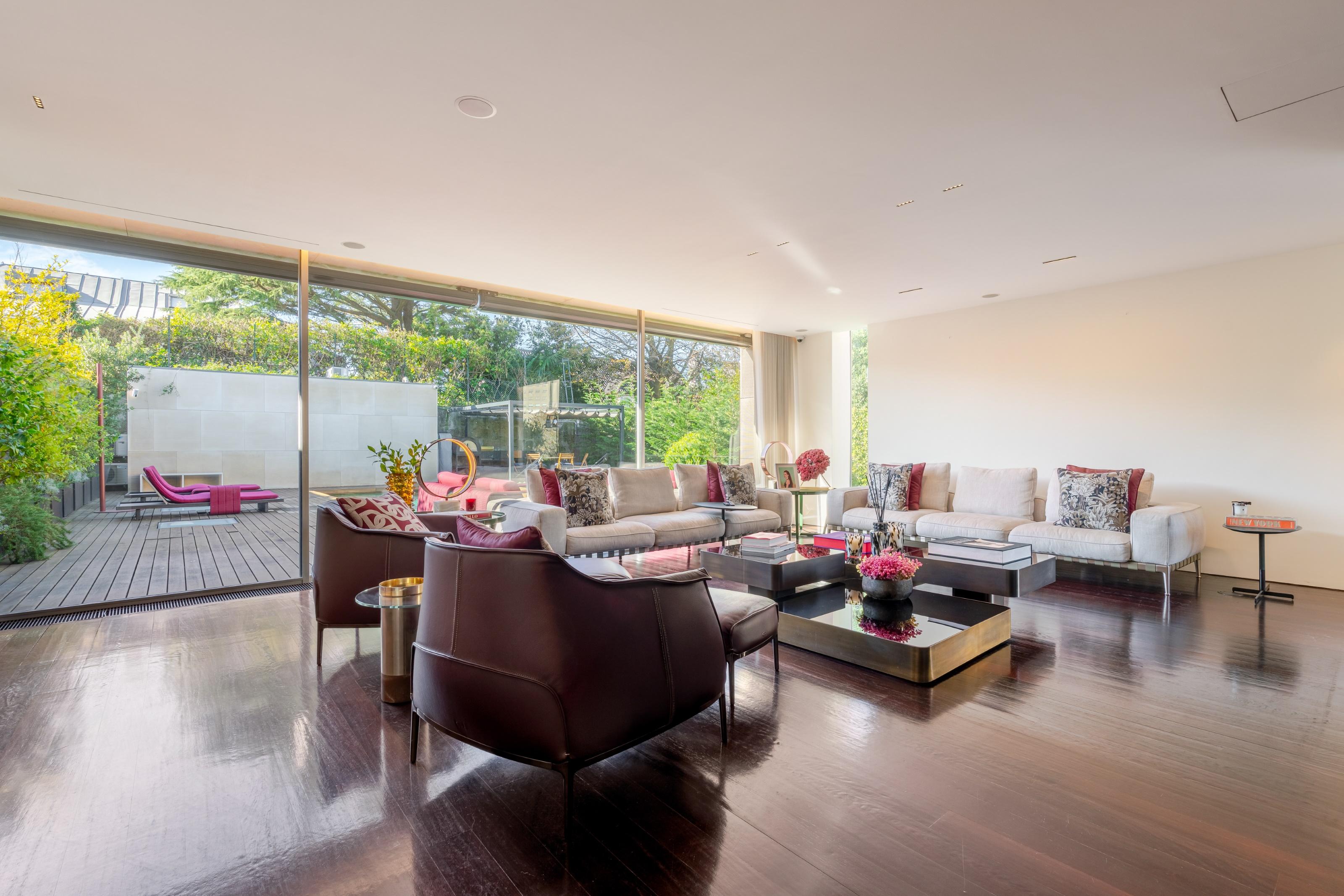 The lower floor houses a multimedia room, gym, laundry and two suites, one of which currently functions as an office. The main floor concentrates the social areas with a living room that includes a bioethanol fireplace and garden access, kitchen clad in Taj Mahal quartz and fully equipped, dining room and guest powder room. The upper floor is dedicated to the private area with three suites, each with walk-in closet and marble-clad bathroom. The library features artistic wallpaper ‘Le Couple’ by Louise Bourgeois.
