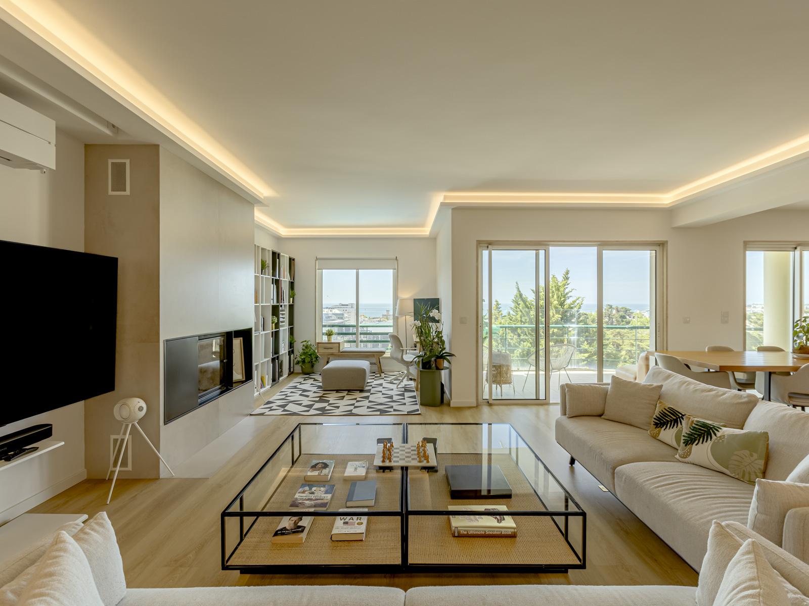 5- bedroom penthouse apartment, with 270 sqm of private gross area and 136 sqm of dependent gross area, with sea view, 5 garage spaces, located in a condominium with swimming pool, in Estoril, Cascais.