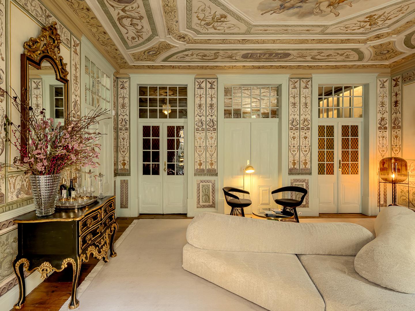 Set in an 18th-century Pombaline building with elevator, the apartment features generous social areas, including living room, dining room and library, enhanced by original mural paintings and 18th-century tile panels. It comprises four bedrooms, two of them en-suite, a spacious kitchen with dining area and several bathrooms functionally distributed throughout. The average ceiling height of approximately 3.5 meters reinforces the spaciousness and natural light in all areas. The balcony harmoniously integrates with the interior space, offering views over the Tagus River and the city.