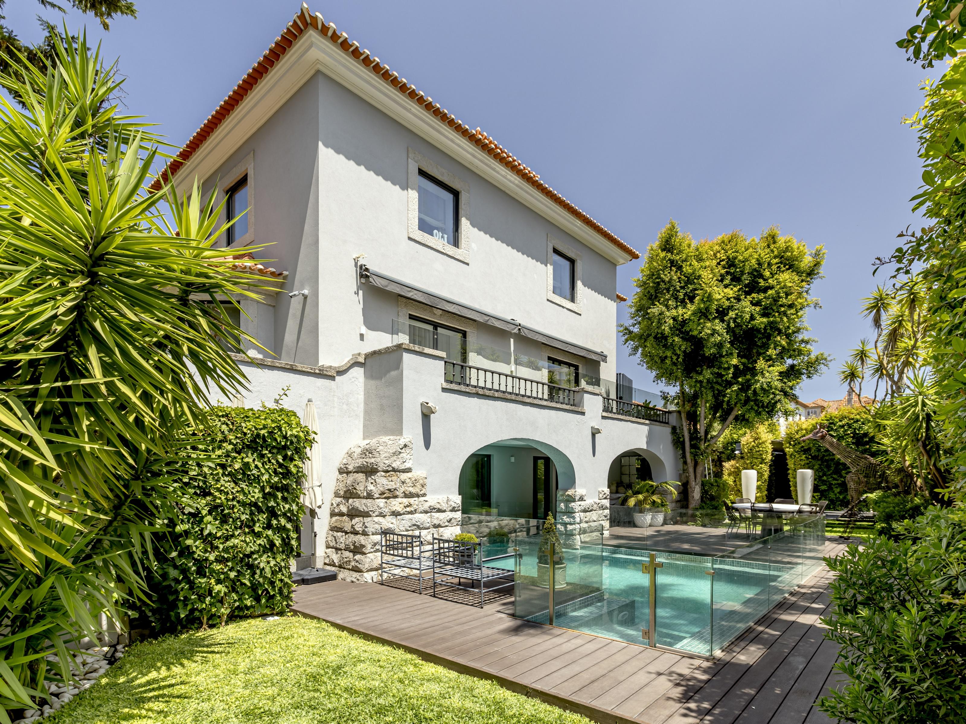 This villa, designed by the architect Raul Lino, was completely renovated in 2018, standing out for its excellent materials, and is distributed over four floors. The -1 floor consists of a living room with access to the garden and swimming pool, a wine cellar, a kitchen to support the swimming pool, a suite, a service bedroom suite, a bathroom, and another living room also with access to the garden. With access from the garden, there is also a bathroom, a technical area, and parking for up to 3 cars. The ground floor has an entrance hall, an office, a living room, a dining room with a connecting door to the fully equipped kitchen, a pantry, a guest bathroom, a lift to access the -1 floor, a bathroom, and a living room.The first floor has three bedrooms, one of which is a suite with two bathrooms and a closet, and another bathroom to support the other two bedrooms. On the 2nd floor, we have a room that could be an office or even a bedroom.