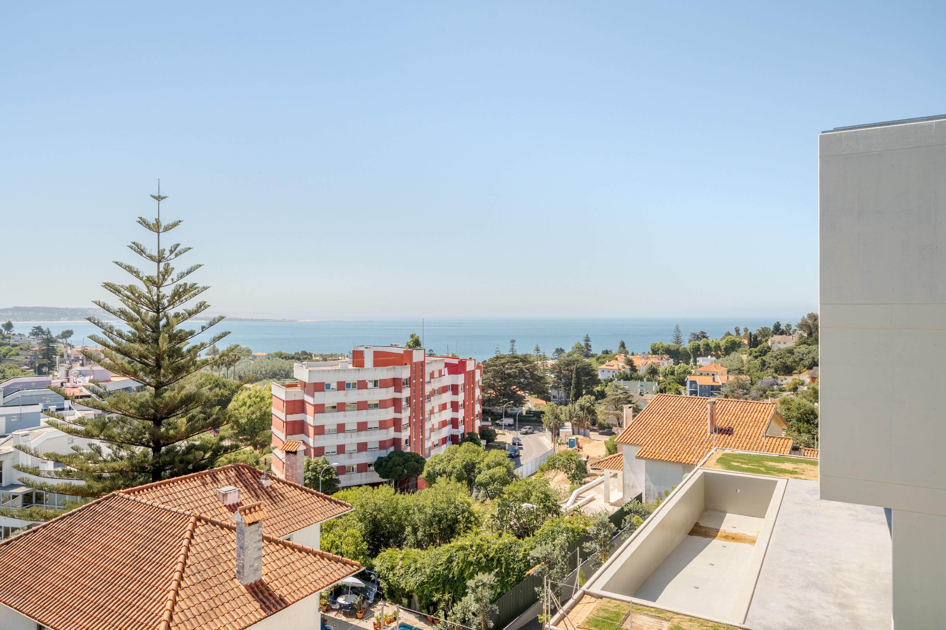 5+2-bedroom villa with 408 sqm of gross construction area, set on a 675 sqm plot of land, with fantastic river views, in Alto do Lagoal, Oeiras. This extraordinary property is a project by renowned architect Eduardo Souto Moura and stands out for its pigmented exposed concrete monobloc structure, anchored in the hillside and designed towards the sea. The blind façades provide privacy and balance with fully glazed faces, offering wide balconies with a privileged view of the Caxias valley and the Tagus River, which leads to the sea.
