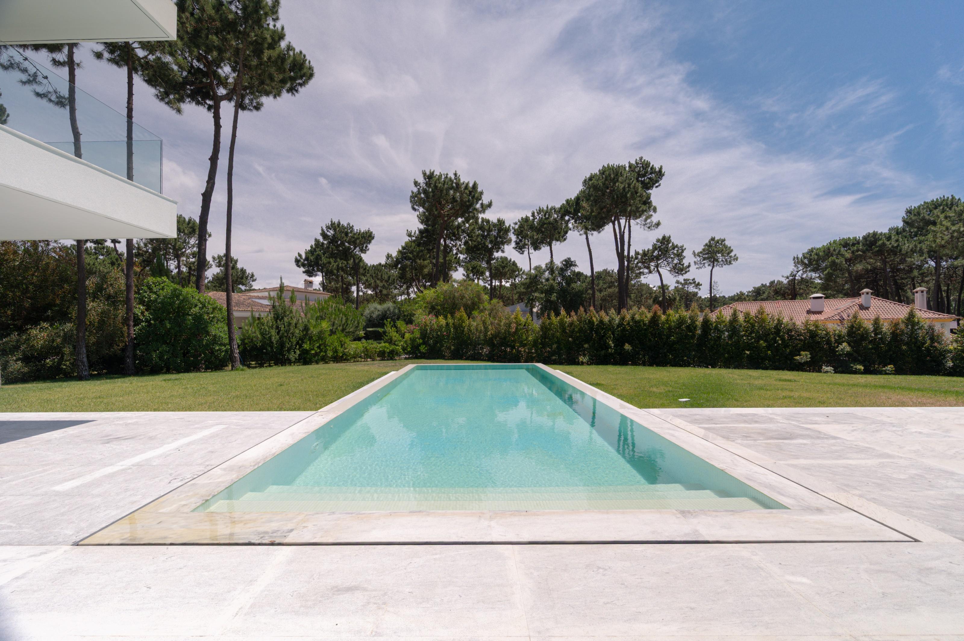 The outdoor pool, with an infinity edge effect, harmoniously connects the home’s environment and the surrounding landscape, creating a haven of serenity.