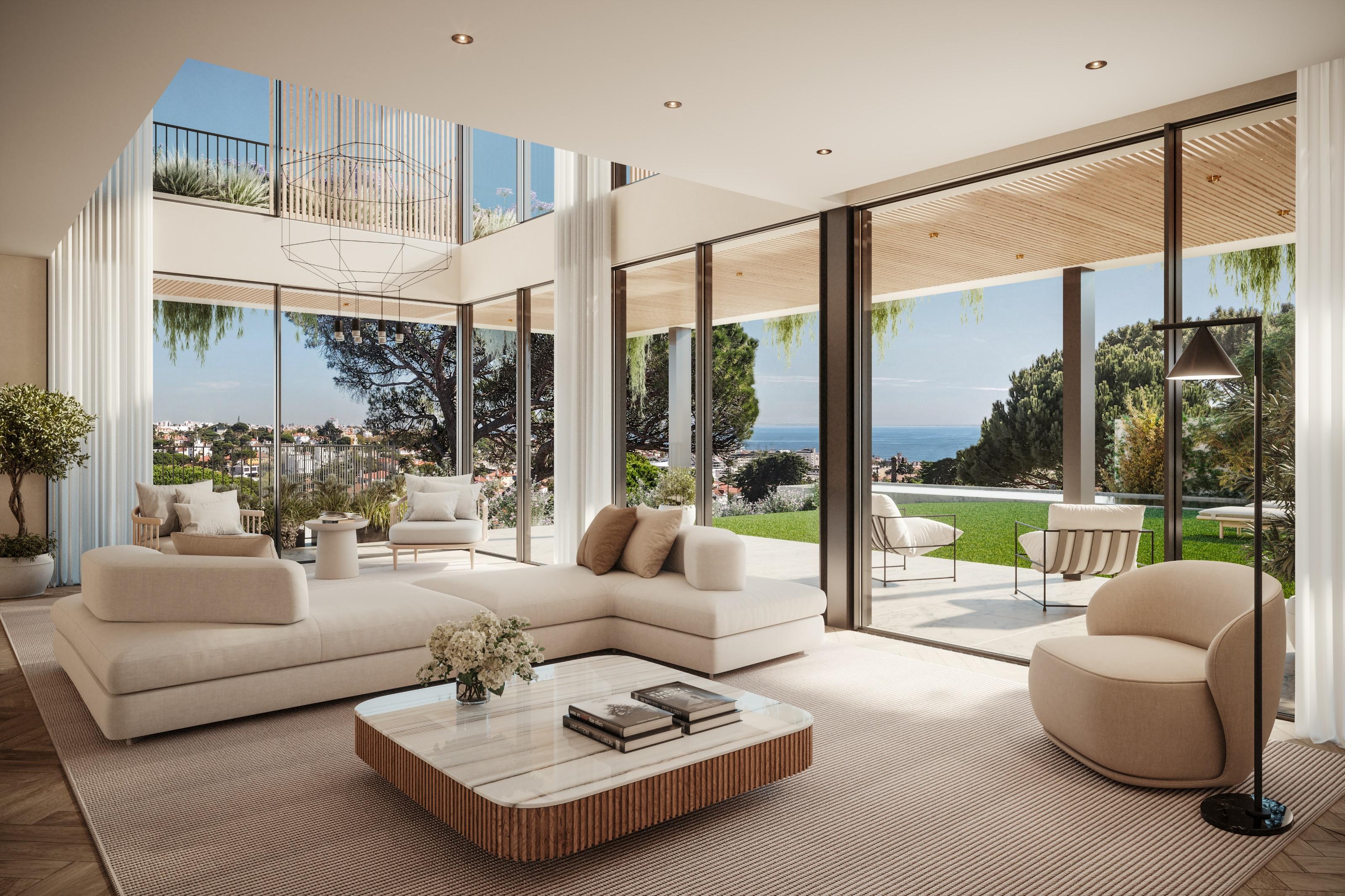 6+3 bedroom villa with 1,223 sqm of gross construction area, sea view, swimming pool, gym, spa, elevator, and four garage spaces, set on a 933 sqm plot in the center of Estoril, Cascais.