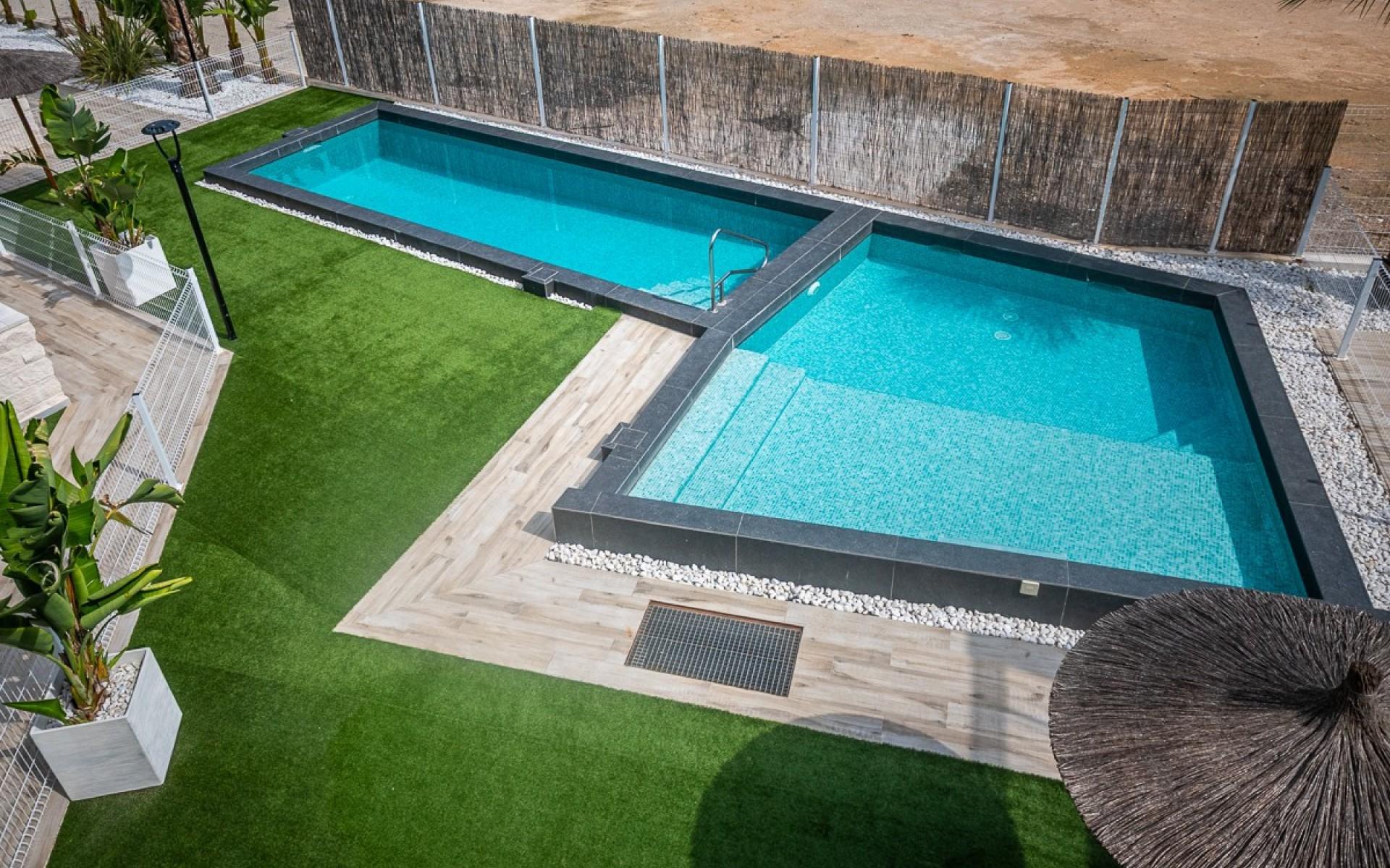Beautiful ground-floor corner apartment in Lo Crispin. Modern, move-in ready, and sunny! Welcome to this beautiful ground floor apartment in Lo Crispin, built in 2022 and designed with an eye for comfort, light and space. This property is ideal for those looking for a modern, move-in ready place under the Spanish sun. The apartment has two spacious bedrooms and one modern bathroom. The open-plan living space combines a cosy sitting and dining area with a practical U-shaped kitchen. Thanks to the clever design, there is even space to have breakfast at the counter, with a view of the terrace. As a corner apartment you enjoy extra light and privacy. The outdoor area is spacious and perfect for relaxing, sunbathing or enjoying a meal with family and friends. A big plus: the apartment is sold fully furnished and ready to move in. All furniture and furnishings are of high quality, carefully chosen to create a modern, warm atmosphere. All you have to do is pack your bags and enjoy! The residence offers a beautiful communal swimming pool with pleasant sunbathing areas and an indoor area with toilet facilities, ideal for a day at the water without having to return to the apartment each time. In addition, the apartment has an underground garage/parking space and a private storage room: useful for bicycles, beach equipment or extra storage. Location: Lo Crispin and surroundings Lo Crispin is a quiet, well-maintained residential area just a few minutes from Ciudad Quesada and Algorfa, with excellent connections to the coast and all amenities. In the immediate vicinity you will find cozy bars, restaurants, supermarkets and sports facilities. The beautiful beaches of Guardamar del Segura and Torrevieja are just a 15-20 minute drive away, while Alicante Airport can be reached within 40 minutes. This location offers the best of both worlds: a peaceful residential area with a central location to discover the best of the Costa Blanca. A modern, stylish, and fully move-in ready apartment where comfort and quality of life are paramount, perfect for enjoying Spanish life right away! Contact us today for more information or to arrange a viewing – this move-in ready apartment in Lo Crispin awaits you!