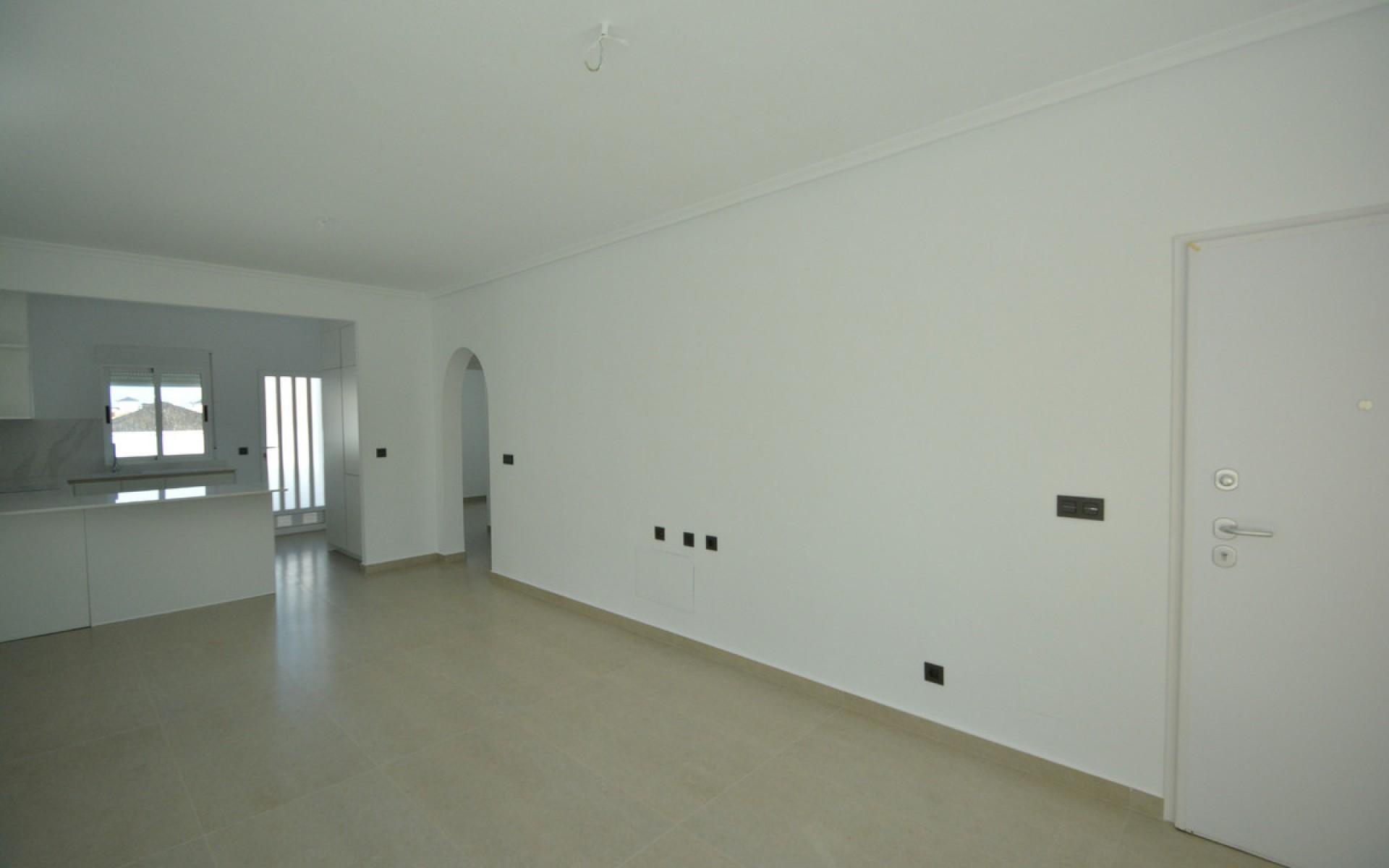 This charming detached house is located in the quiet residential area of Lo Crispin, Algorfa. The area is known for its peaceful atmosphere, easy access to services, and proximity to the beaches of Guardamar del Segura, only about 15 minutes away. The La Finca Golf Resort is just a 5-minute drive, Alicante city is around 35 minutes away, and Alicante Airport can be reached in about 30 minutes. The property offers a constructed area of 68 m² and a usable area of 44 m². It has two bedrooms and one completely renovated bathroom. The open-plan kitchen is brand new, equipped with new appliances, and connects seamlessly with the bright living area, which includes a split air conditioning unit. The entrance door is armoured for extra security. The house has been fully renovated, featuring new fitted wardrobes, new interior doors, new flooring, and fresh paint both inside and outside. The exterior area has been recovered in concrete, providing low maintenance and a clean, modern look. This south-facing home enjoys a private solarium of 36 m² with the possibility to create an additional room on the roof terrace. There is also a utility or storage room with access from the outside, water connections in the garden and solarium, and space to park up to two cars on the private plot. The covered porch can be glazed to expand the living area if desired. The urbanization is quiet and well-maintained, offering a communal swimming pool for residents. The property is sold unfurnished. Taxes and other purchase expenses are not included in the price.