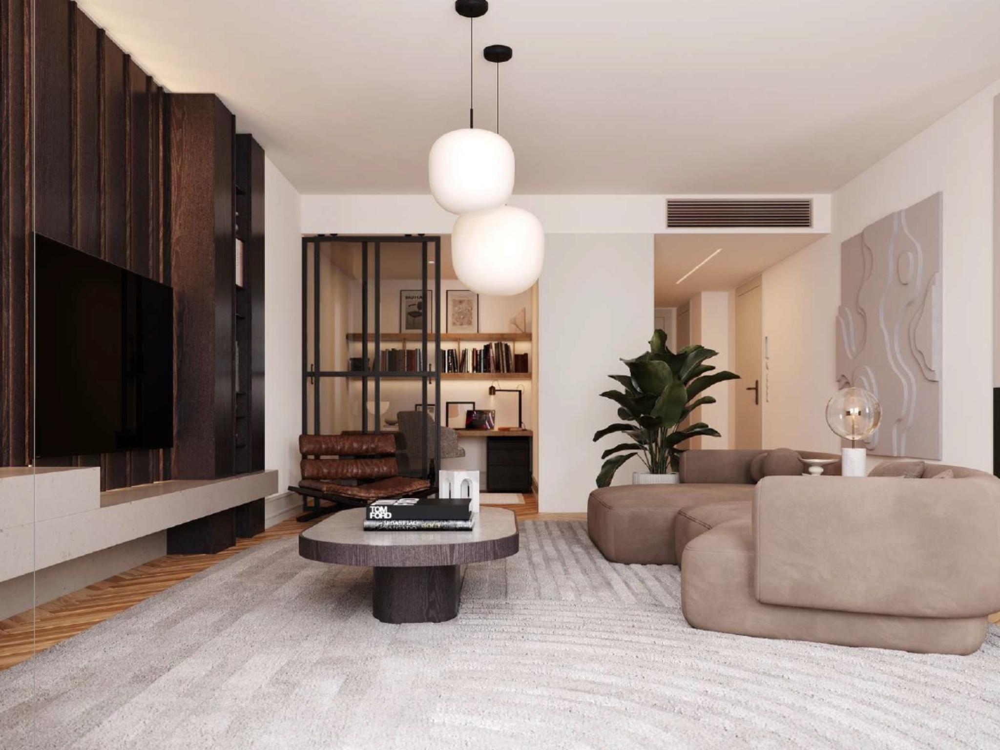 Dispõe de sala, cozinha equipada, três quartos, um dos quais em suite e uma varanda. Instalação de ar condicionado centralizado embutido, projectores LED e aquecimento das águas sanitárias por bomba de calor.