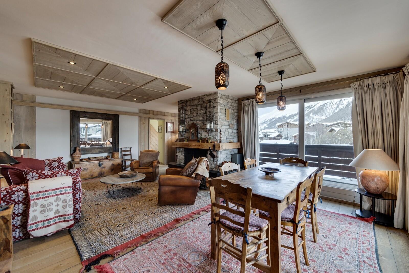 The spacious living area stands out for its inviting ambiance and warm atmosphere, enhanced by a stunning stone fireplace. The semi-open, fully equipped kitchen integrates seamlessly into this cozy and elegant environment, perfect for sharing special moments after a day on the slopes.