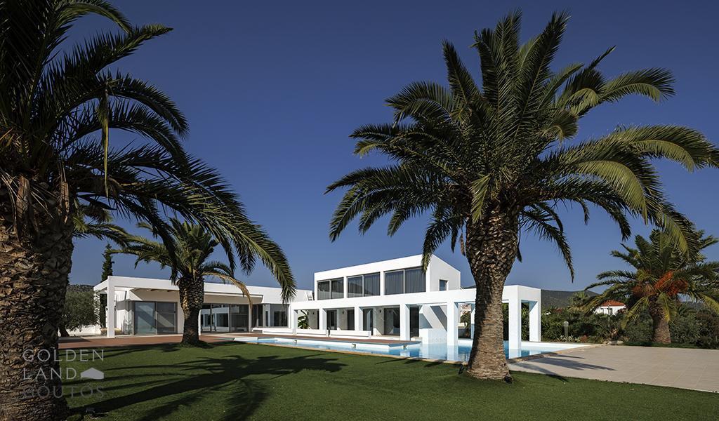 This modern frontline villa offers breathtaking views of the Saronic Gulf, Hydra Island, and the picturesque island of Dokos. Designed with bold character, it provides a stunning panorama through its large glass openings. The spectacular sea view unfolds from the pool as well as from the room balconies, creating an idyllic setting for relaxation and admiration of the landscape.