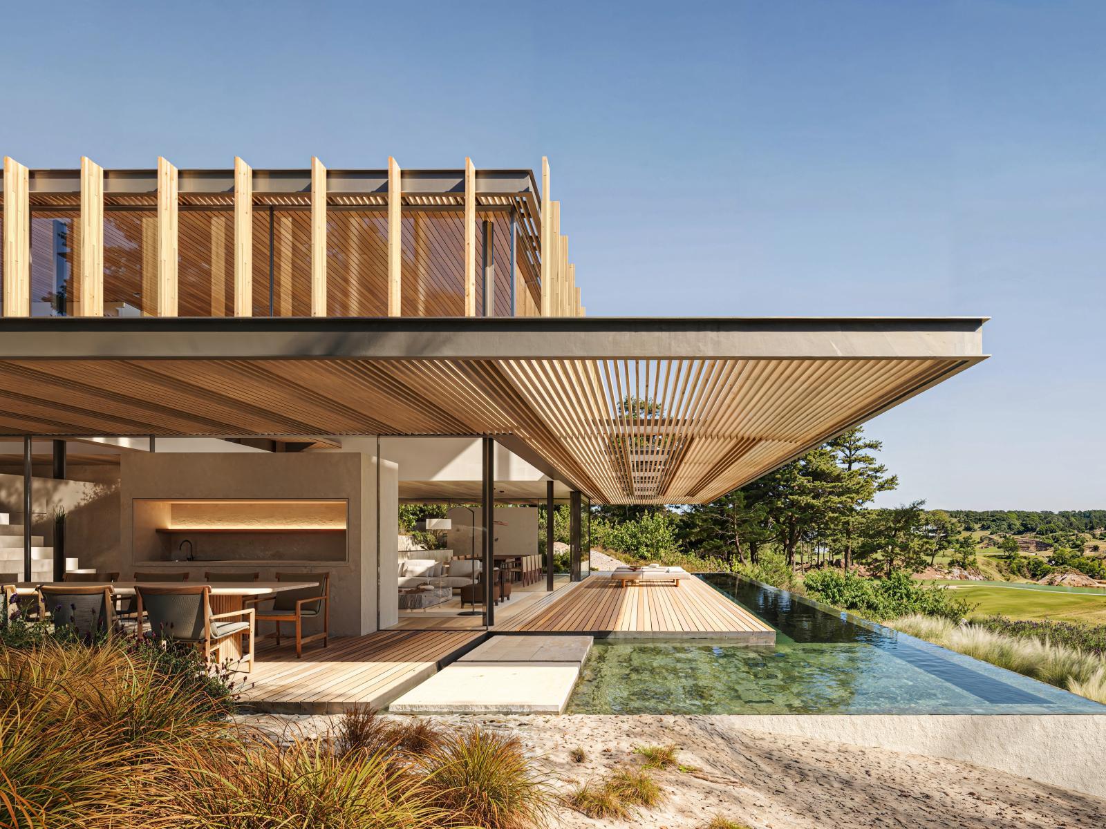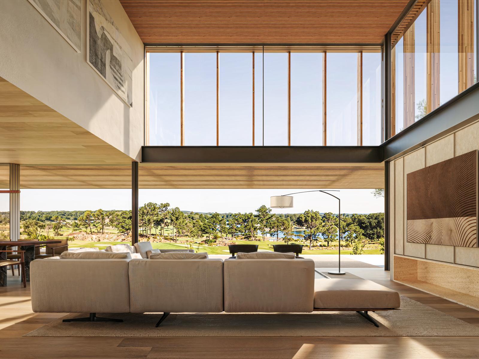 5 bedroom villa in Melides, with 330m² of internal living area spread over three floors, including basement (except garage), set in a plot of 1,000m² in Pinheirinho Comporta, on the first line of golf, with architecture signed by the prestigious Jacobsen office that enhances the integration between interior and exterior.
