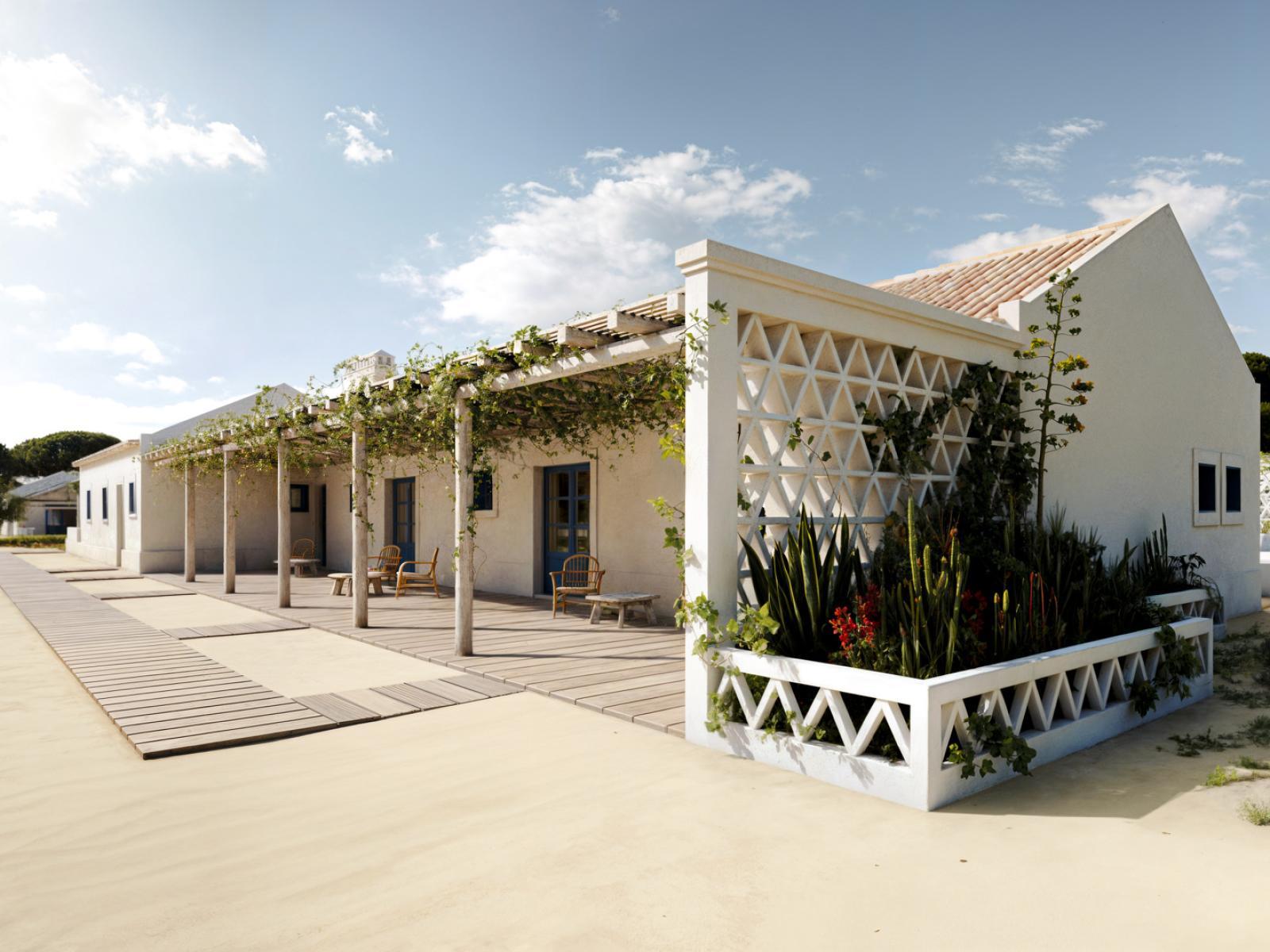 The project is characterised by respecting the traditional design of the region, with a tiled roof, pavement in Portuguese cobblestone, the façade and doors in white and blue tones and also the outdoor area with pergolas and wooden deck.