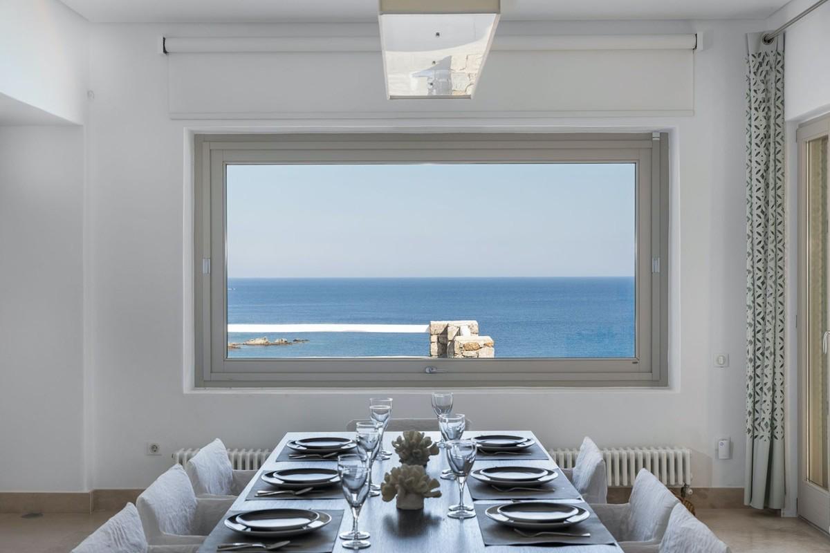 The villa offers glorious outdoor areas perfect for entertaining, relaxation, and enjoying the unrivaled natural surroundings. The vanishing edge seawater pool is a standout feature, allowing guests to swim into infinity while taking in the magnificent view of the Aegean. This is the ultimate place to unwind, bask in the sun, or host intimate gatherings.