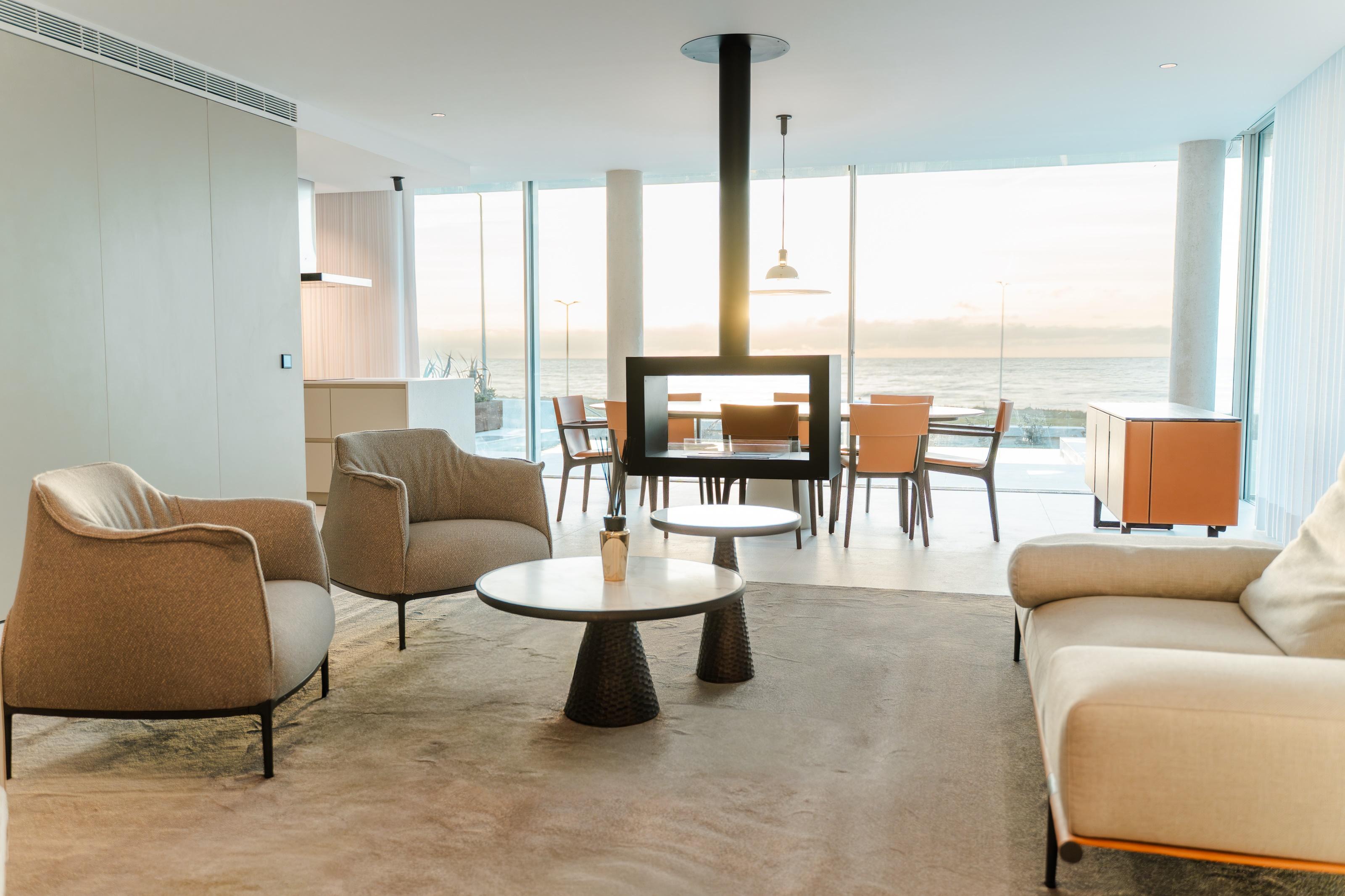 Outside, the generous terraces and the private garden expand the experience of living on the sea. The infinity pool visually merges with the Atlantic, creating an environment of rare serenity – a space where time slows down and each evening is transformed into a natural spectacle.