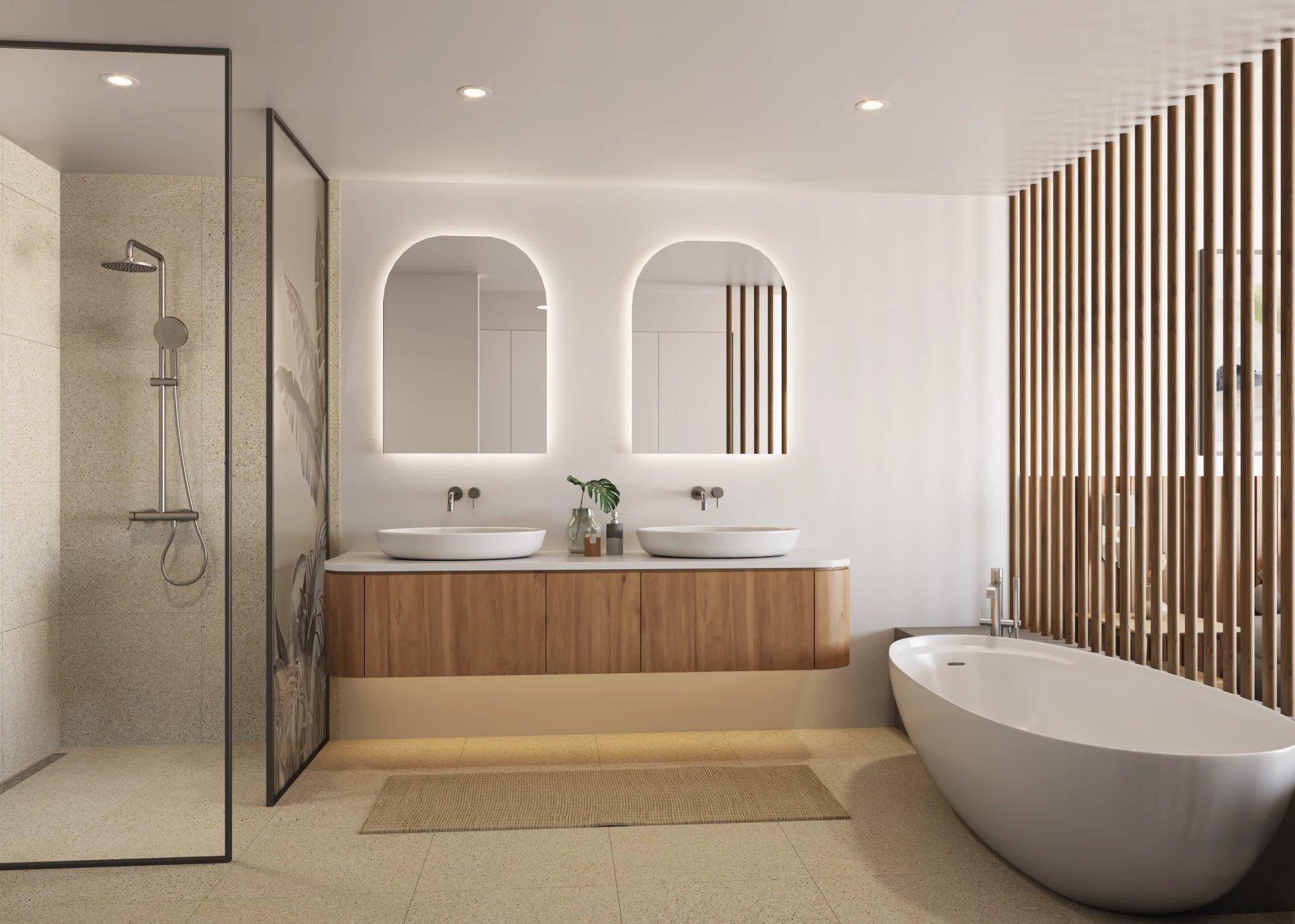 With a spacious 394 m² floor area, each penthouse offers four en suite bedrooms, a private Jacuzzi and exclusive elevator access. The living spaces, bathed in natural light thanks to sliding bay windows, create a perfect continuity between inside and outside. Materials such as wood and natural stone create a soothing, timeless atmosphere, while the contemporary, boho-chic interior design reflects the relaxed refinement of the region.