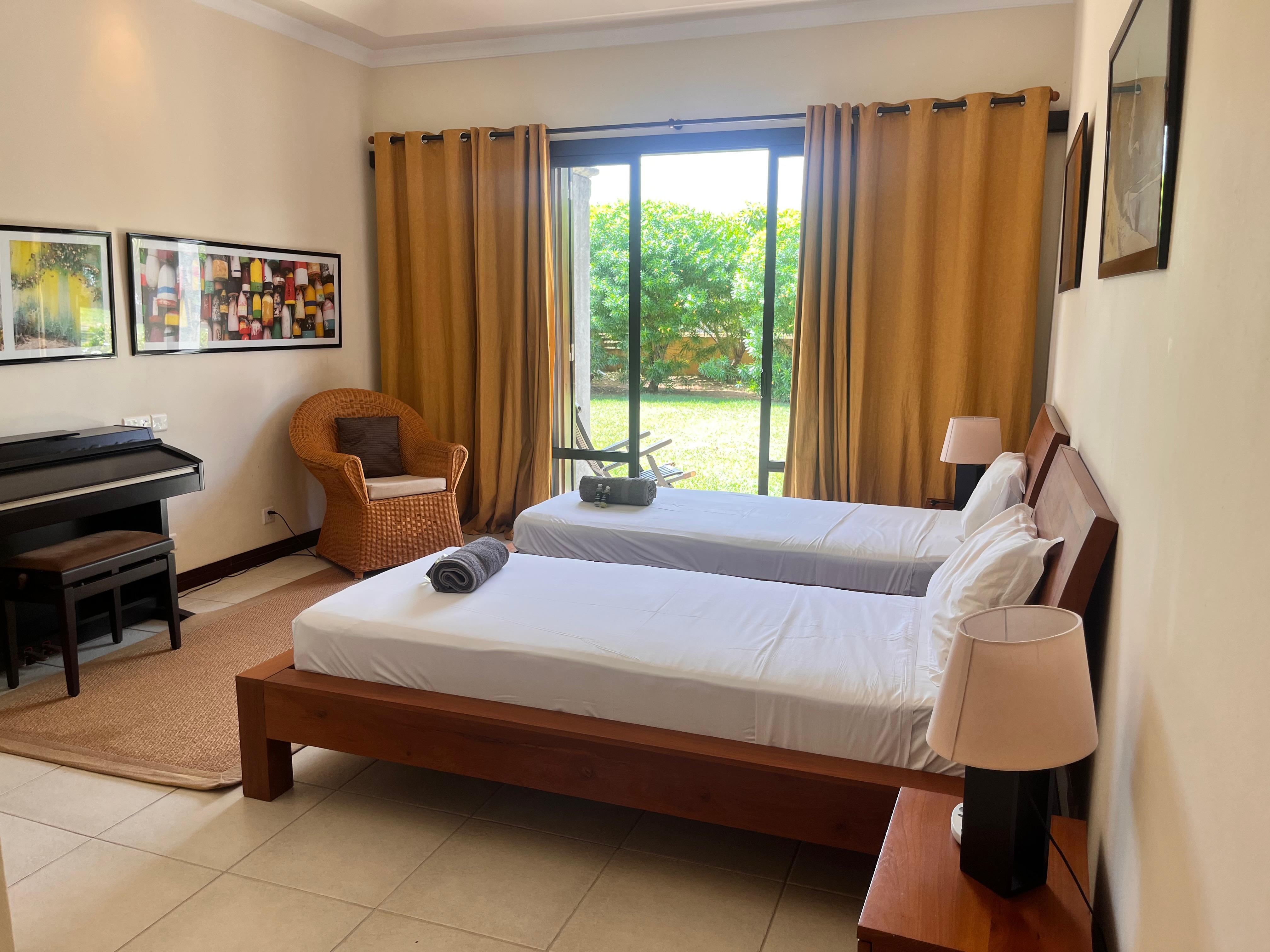 The villa features several bedrooms designed for comfort and privacy, all enjoying open views over the garden. The master suite benefits from direct outdoor access, enhancing the sense of space and tranquility.