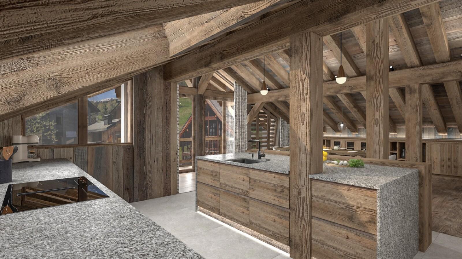 The south-western exposure and large windows ensure optimum light throughout the day, while offering breathtaking views of the mountains, in particular the Saulire. The 100 m² open-plan living space is distinguished by its elegance and conviviality, while the summer kitchen and large terrace make the most of this unique natural setting.