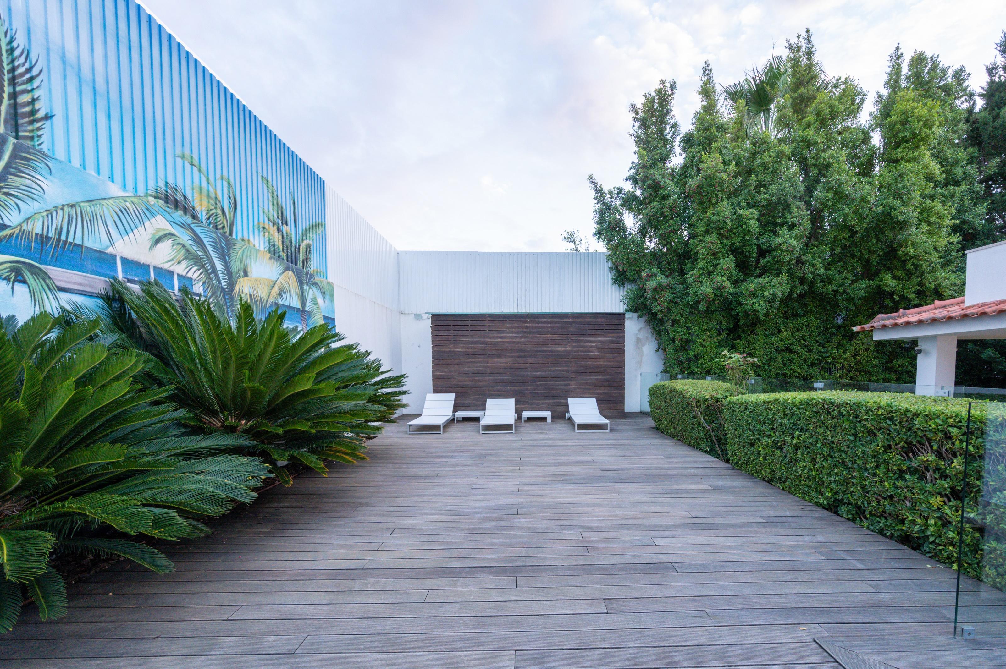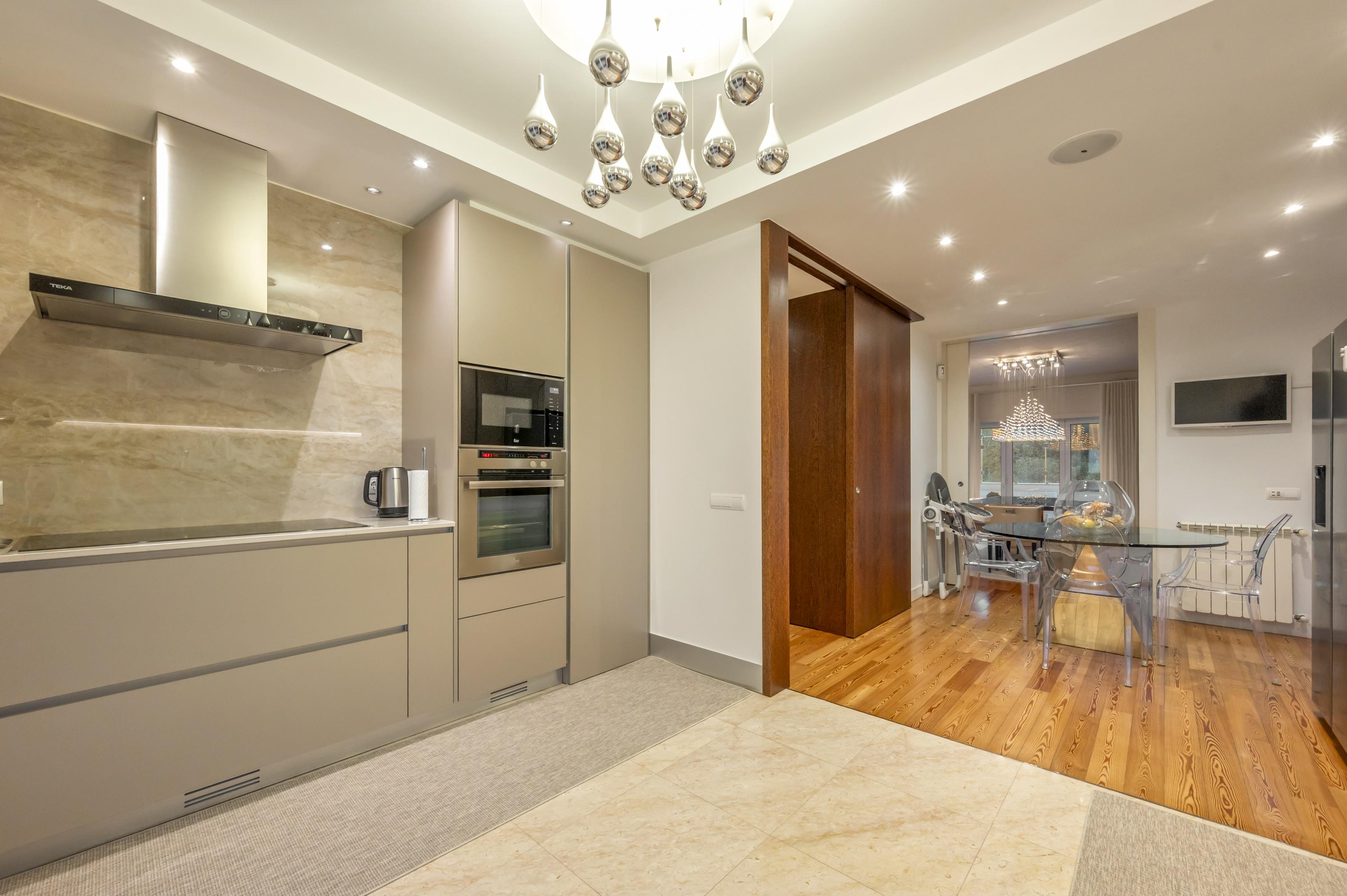 On the middle floor is the living and dining room, with connection to a glass winter balcony overlooking the garden. The kitchen, with direct access to the outside, communicates with the pool area and the barbecue area, creating a functional space to entertain.