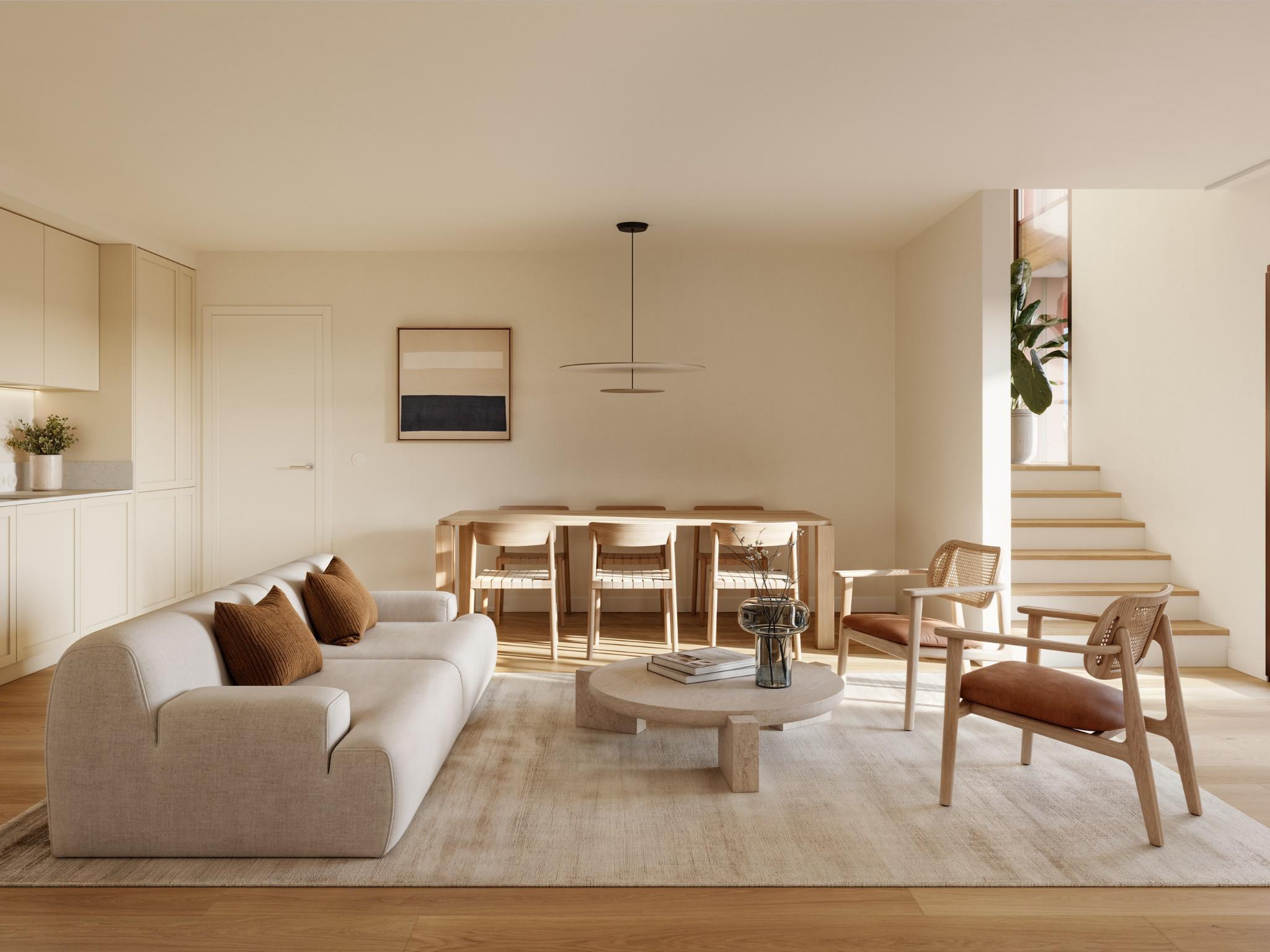 New 3-bedroom apartment, duplex, with 135 sqm of private gross area, terrace, parking, and storage, at ALMAR Beach in Almada. The apartments feature private balconies or terraces, equipped kitchens, and parking, all developed with sustainability and functionality in mind.