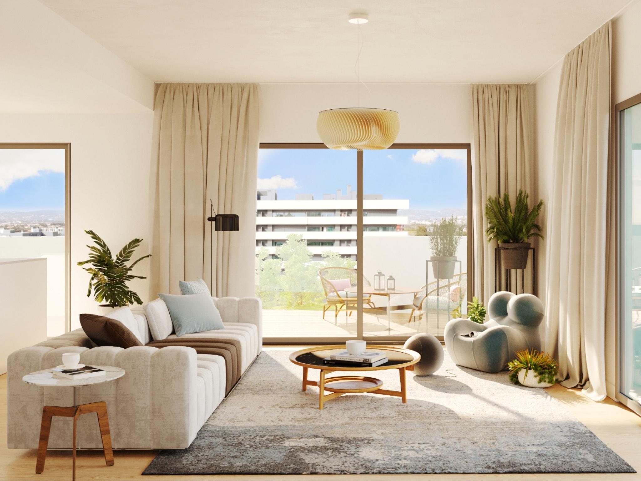 New 3-bedroom apartment, with 117 m2 of gross private area, including parking, swimming pool and terrace, in the Panoramic Pool condominium, in Faro, Algarve.